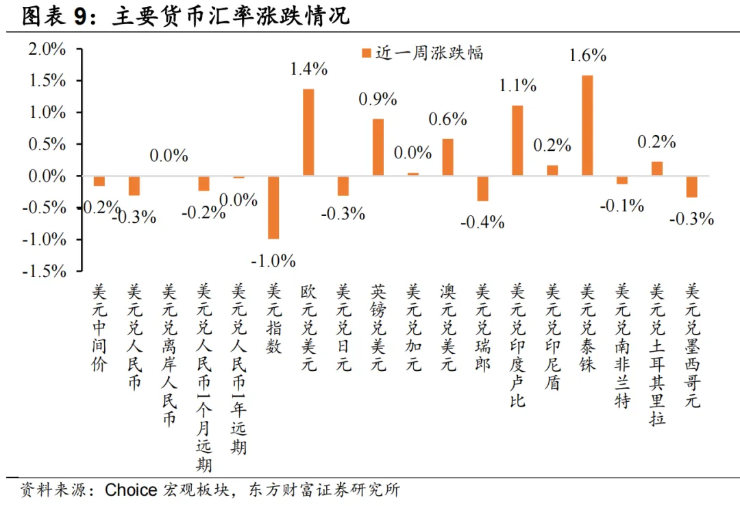 汇率市场:美元走弱,非美货币普遍反弹。美联储面对通胀难以加息,美元指数(USDX)回落-1.0%;英国央行和欧洲央行等其他央行相较于美联储表现得更“鹰派”,推动主要非美货币普遍升值。英镑兑美元与欧元兑美元分别上涨0.9%和+1.37%。避险属性的日元亦有走强,美元兑日元下跌0.31%。人民币汇率保持双向波动的平稳态势,表现出较强韧性。美元兑人民币中间价下跌 -0.16%,美元兑离岸人民币上涨0.01%。