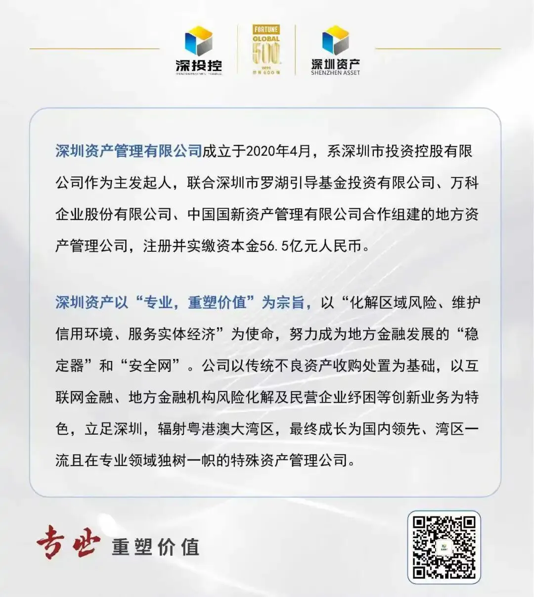 作为一家新型资产管理公司,深圳资产自2020年4月成立以来便以“专业,重塑价值”为理念,定位于以不良资产服务为核心的金融风险化解平台,积极发挥股东协同作用,着力维护地方金融稳定,探索开展全方位、多形式的合作,在上市公司企业纾困、上市公司大股东股票质押风险处置、房地产金融风险化解等方面做出了积极的尝试。所属子公司共赢资产管理有限公司积极立足“网贷资产处置市场化解决方案的提供者和重要参与者”的定位,稳步推进网贷平台风险化解工作,科技手段助力清收处置。截至2021年末,公司资产规模已超百亿。
