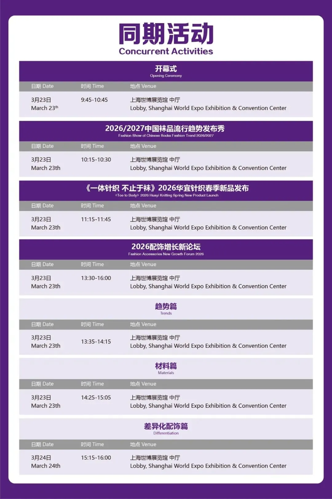 本届展会将继续携手第20届上海国际袜业采购交易会CHPE、第2届上海国际时尚饰品展FJE、第7届上海国际内衣展SUE这3个上海国际时尚配饰展中的系列展同期召开。2026年展会总面积将达到5万平米,2大展馆汇聚近900家展商,一站式打通帽子、帽饰、围巾、丝巾、披肩、手套、发饰、手饰、项饰、耳饰、袜子等多个行业及产业链,届时本届展会将用多样化的时尚细分市场进行联动,共同打造了一场规模宏大内容丰富的流行配饰行业盛宴。
