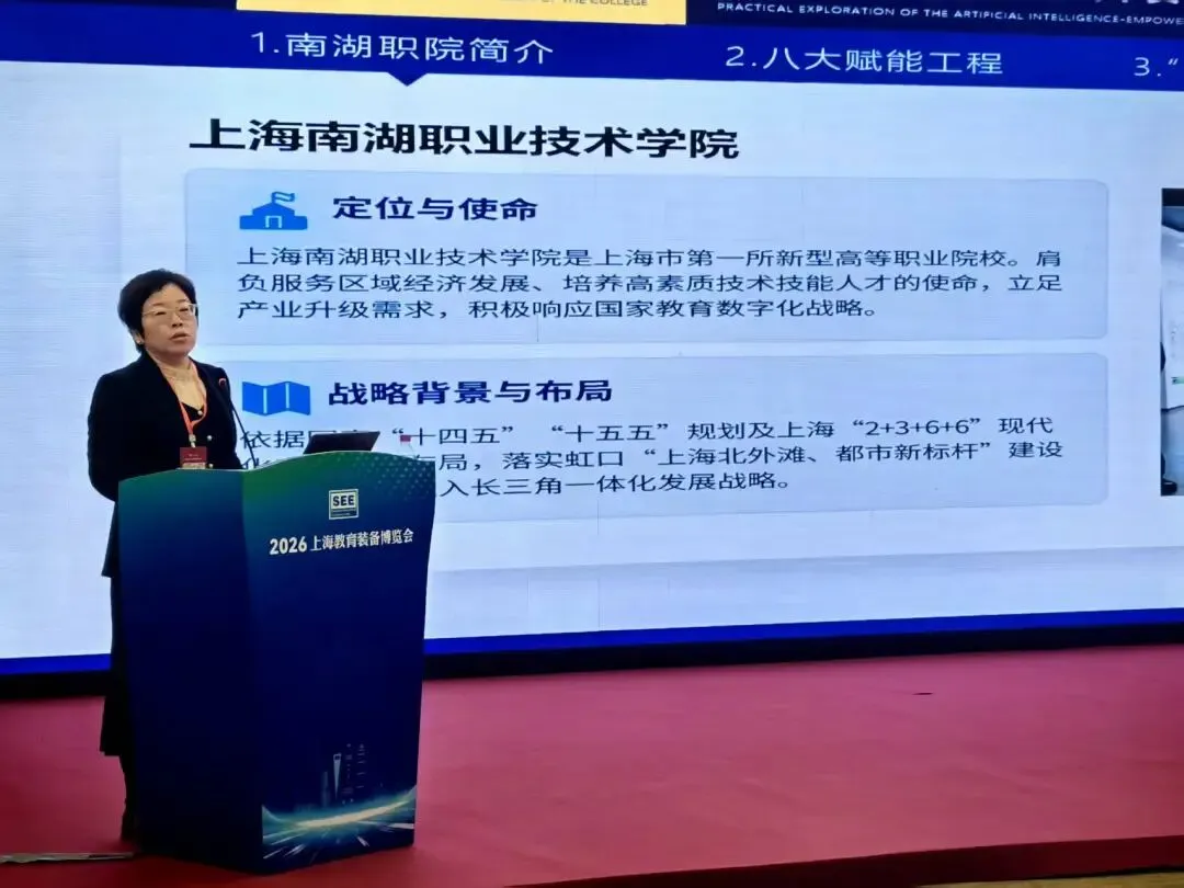 2026年3月21日,由中国教育装备行业协会指导,上海市教育委员会教育技术装备中心支持,上海市教育学会和上海教育装备行业协会主办的2026年上海教育装备博览会在上海汽车会展中心盛大开幕。本届博览会聚焦数字技术赋能、新型学习环境建设、教与学方式变革、教育装备融合创新等主题。学院朱建柳书记受邀在“AI驱动·产教共生——职业教育数智化转型与产业创新实践”高端论坛上,作题为《“人工智能+新能源汽车”产教融合实训中心的构建与实践》的主题报告,分享学院在人工智能赋能职业教育领域的创新实践与思考。