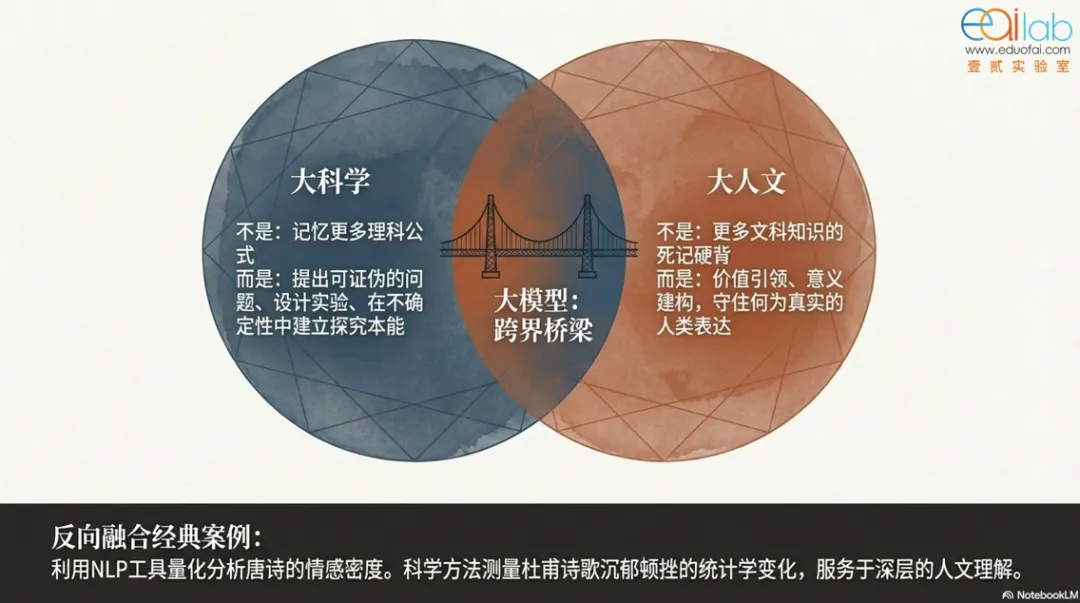 徐研究员指出,文理分科是工业时代的“历史欠债”,已不适应当今知识融合的现实。大模型本身不分文理,能同时处理诗歌与微积分。因此,未来学校应倡导“大科学”与“大人文”:前者培养科学探究的本能,后者守护真实表达与价值判断。二者相互赋能,例如用数据分析杜甫诗歌的情感变迁,实现科学与人文的深度融合。