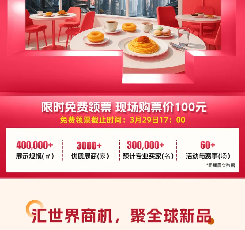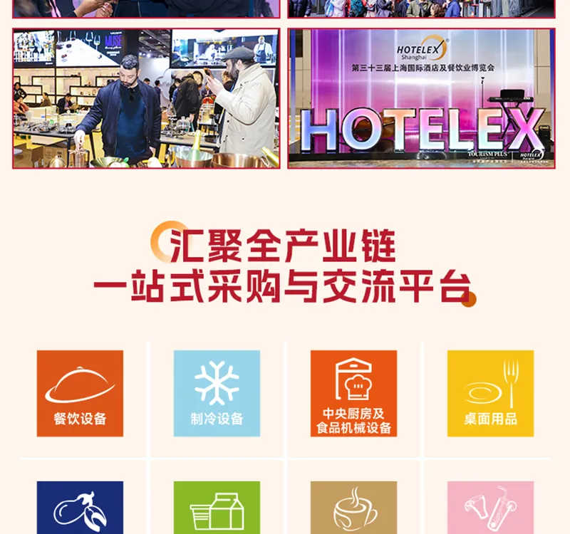 HOTELEX 2026第三十四届上海国际酒店及餐饮业博览会(简称:2026HOTELEX上海酒店餐饮展),将于2026年3月30日-4月2日在国家会展中心(上海)盛大举办!涵盖餐饮设备、桌面用品、食品饮料、咖啡茶饮、烘焙冰淇淋、轻餐美酒、食品机械、食品餐饮包装及机械、连锁加盟等热门板块,为全球酒店及餐饮业从业者创造一个更为开放和高效的交流空间。