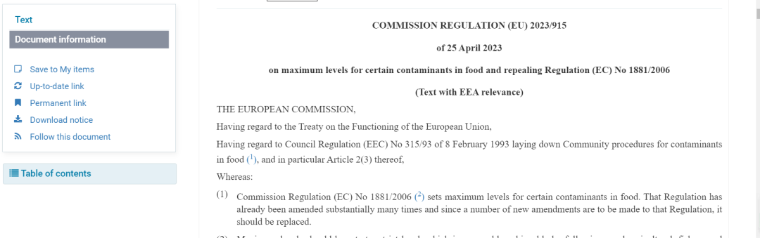 2023年5月5日,欧盟委员会发布 (EU) 2023/915号法规,制订新版食品中污染物限量标准,取代 (EC) No 1881/2006号法规。此次修订内容包括:取消啤酒中镉的最大限量要求等。该法规自欧盟公报公布二十天后生效。据欧盟委员会表示,用于啤酒酿造的啤酒麦芽或谷物可能会有镉的存在,但经酿造后基本残留在剩余的谷物残留物中(该部分不作为食品进入市场),因此啤酒中的镉含量很低,所以本次修订取消了对啤酒中镉的最大限量要求。点击“阅读原文”下载新版法规。