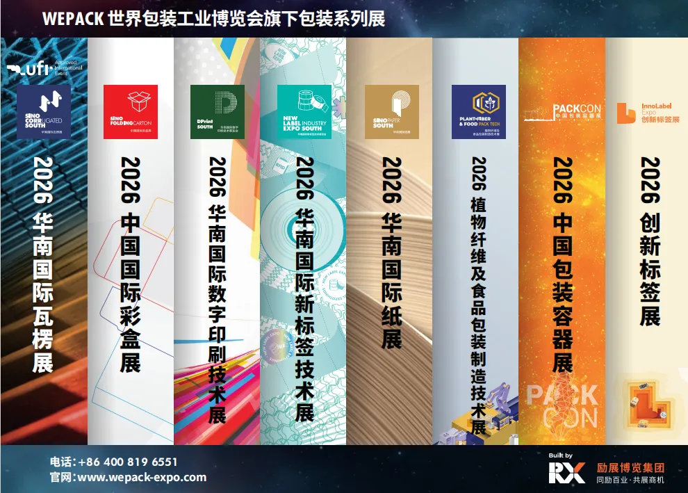 由励展博览集团主办的 2026 WEPACK 世界包装工业博览会将于 2026 年 4 月 15-17 日在深圳国际会展中心盛大召开。届时,2026 华南国际瓦楞展、2026 中国国际彩盒展、2026 中国包装容器展、2026 华南国际数字印刷技术展、2026 华南国际纸展、2026 植物纤维及食品包装制造技术展、2026 华南国际新标签技术展、2026 创新标签展八展同期同地举行,全面呈现从原纸材料、包装加工设备、制造工艺到包装制品的全产业链创新成果。