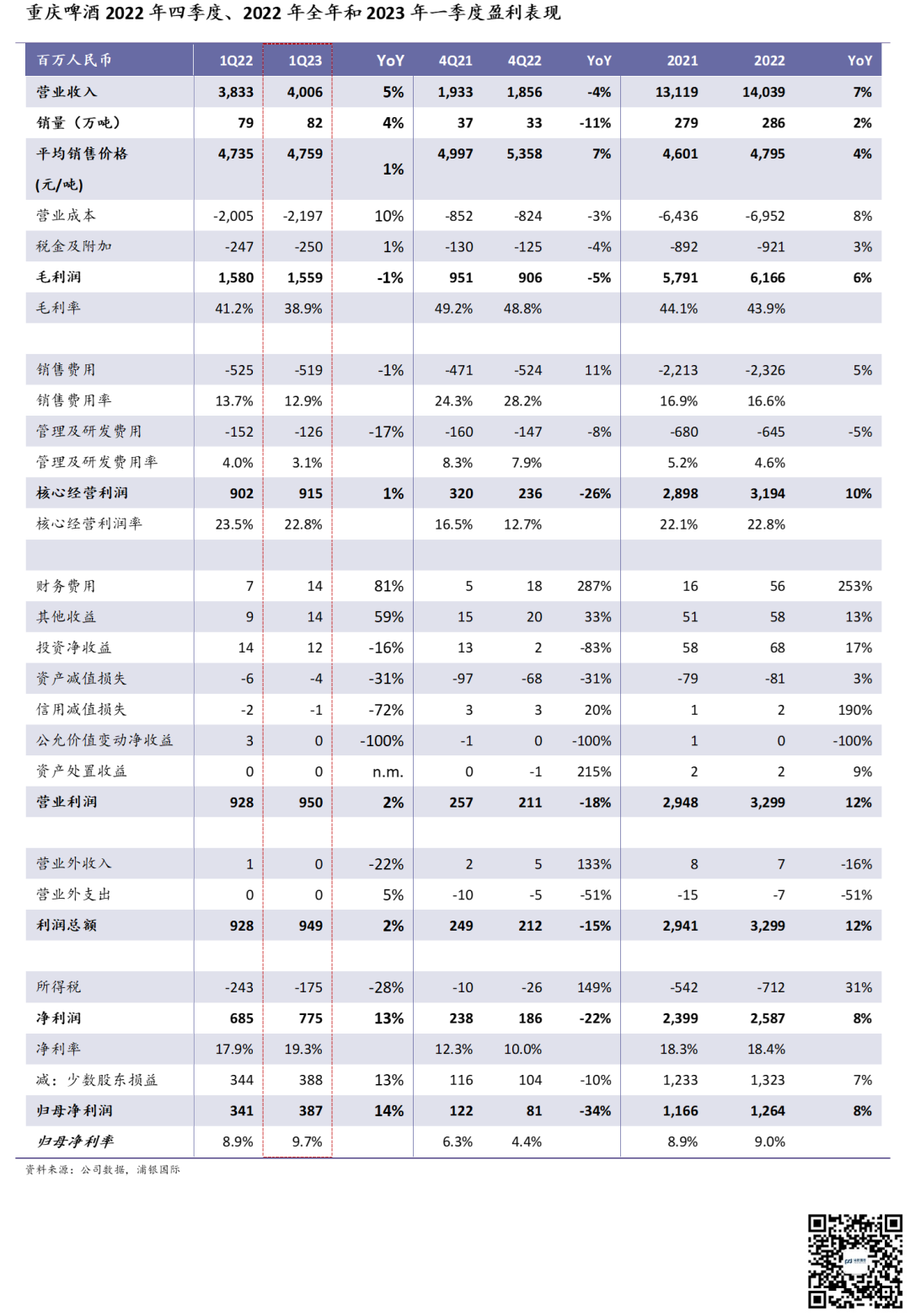 在1Q23非常高的基数下(1Q22收入同比增长17%),重啤整体收入同比增长了4.5%。我们认为,无论是现饮渠道的开工率还是消费情绪,1Q23大概率将是全年的底部。