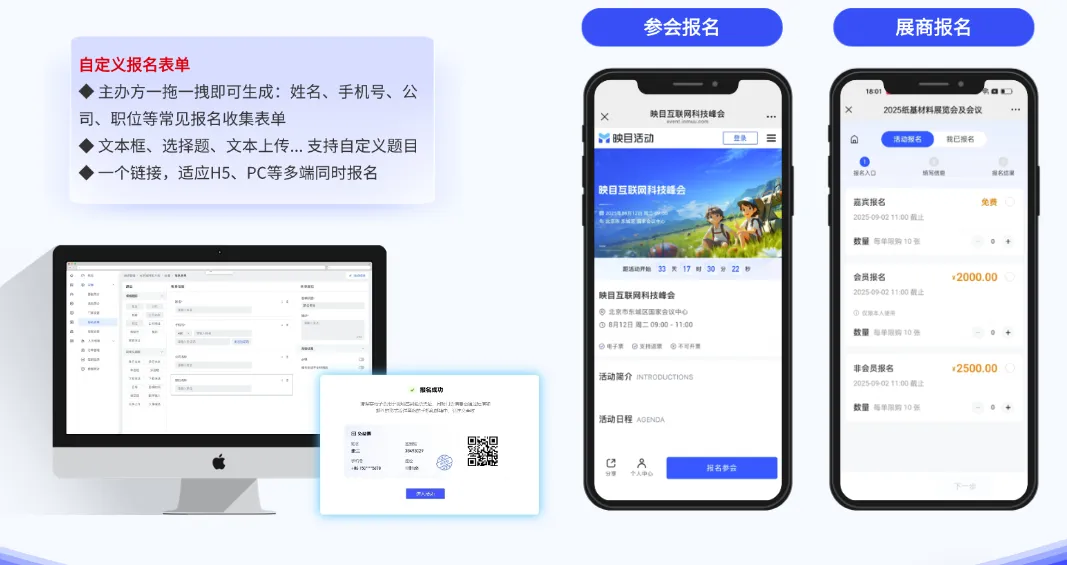 ✅ 全流程报名管理:提供高度灵活的自定义报名表单,支持字段逻辑跳转、企业资质验证、发票信息采集等专业功能,可配置多种票种(如VIP、普通、媒体、展商等)及早鸟优惠策略,精准识别各推广渠道的转化效果,为主办方构建清晰的参会者画像,为后续精准运营奠定数据基础。