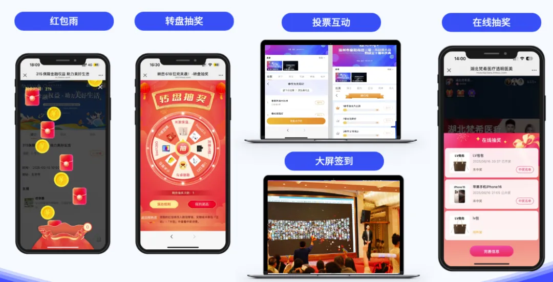 ✅现场互动:映目内置500+互动功能,支持主办方灵活配置互动墙、红包雨、幸运抽奖、实时问卷调研等模块,活跃现场氛围,显著延长用户停留时长,提升品牌曝光与信息触达效率。