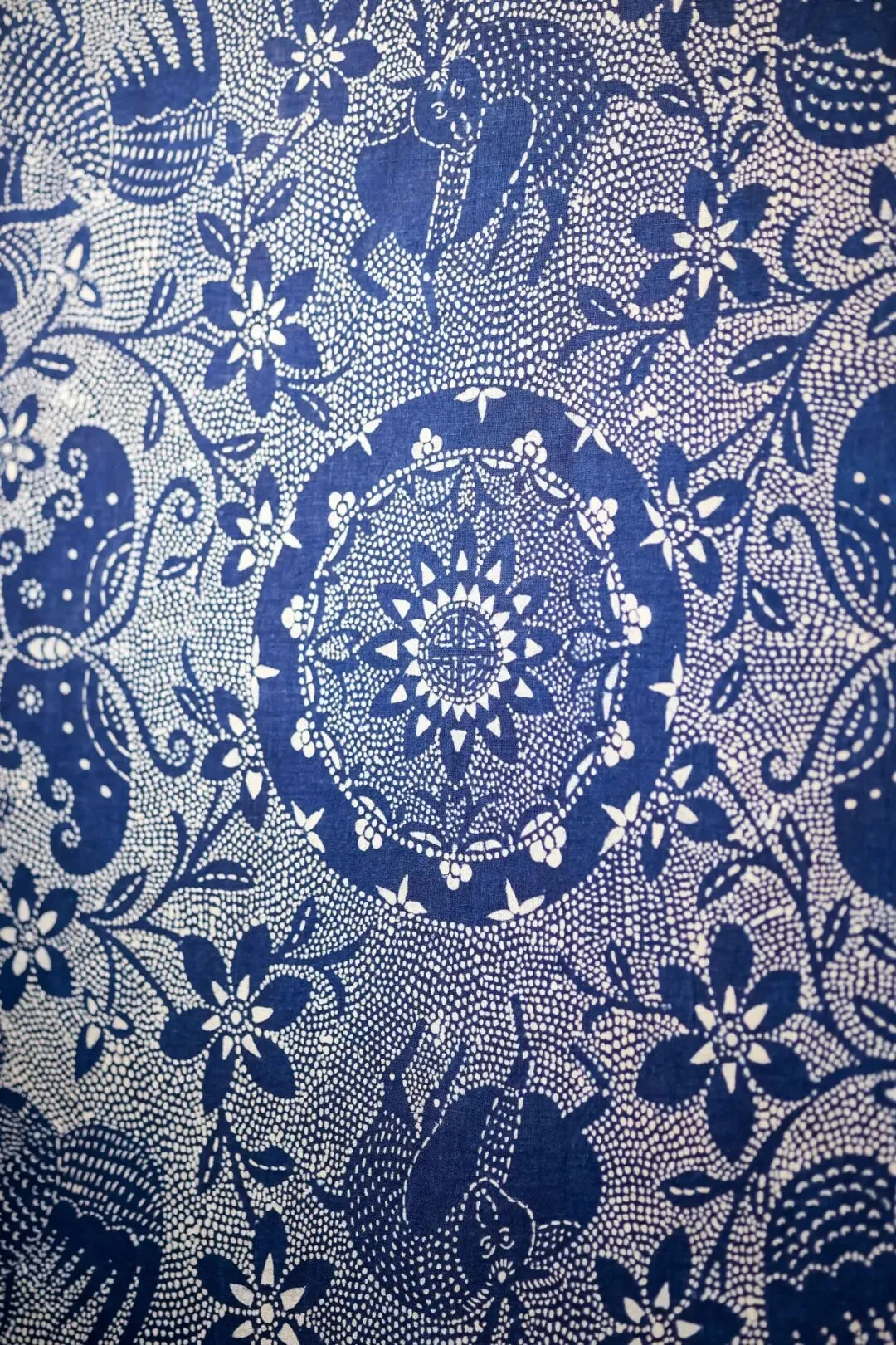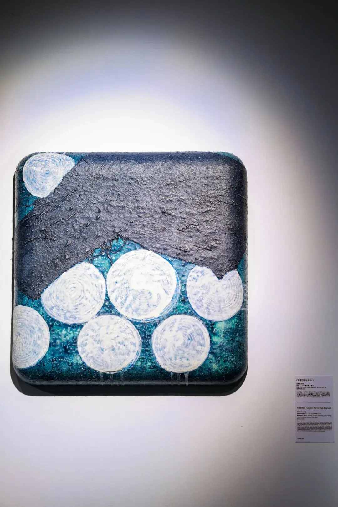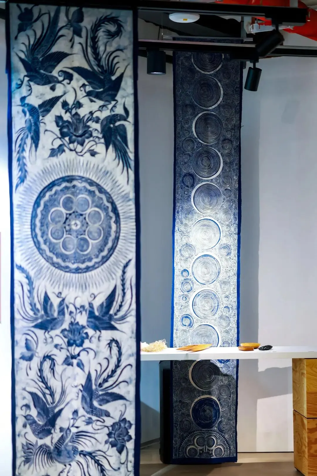 在形式语言上,作品巧妙融合了珊瑚化石的深浅肌理。一半沉降于岁月的厚土,一半绽放于时光的裂隙,纹样如同悬浮于天地间的花瓣,在蓝白交响中定格。画娘以蜡刀为笔,将女性的生命轨迹淬炼为一种纯粹的精神存在:这些纹样虽如化石般凝固了刹那的绽放,却展现出一种“不落凡尘”的空灵意境。