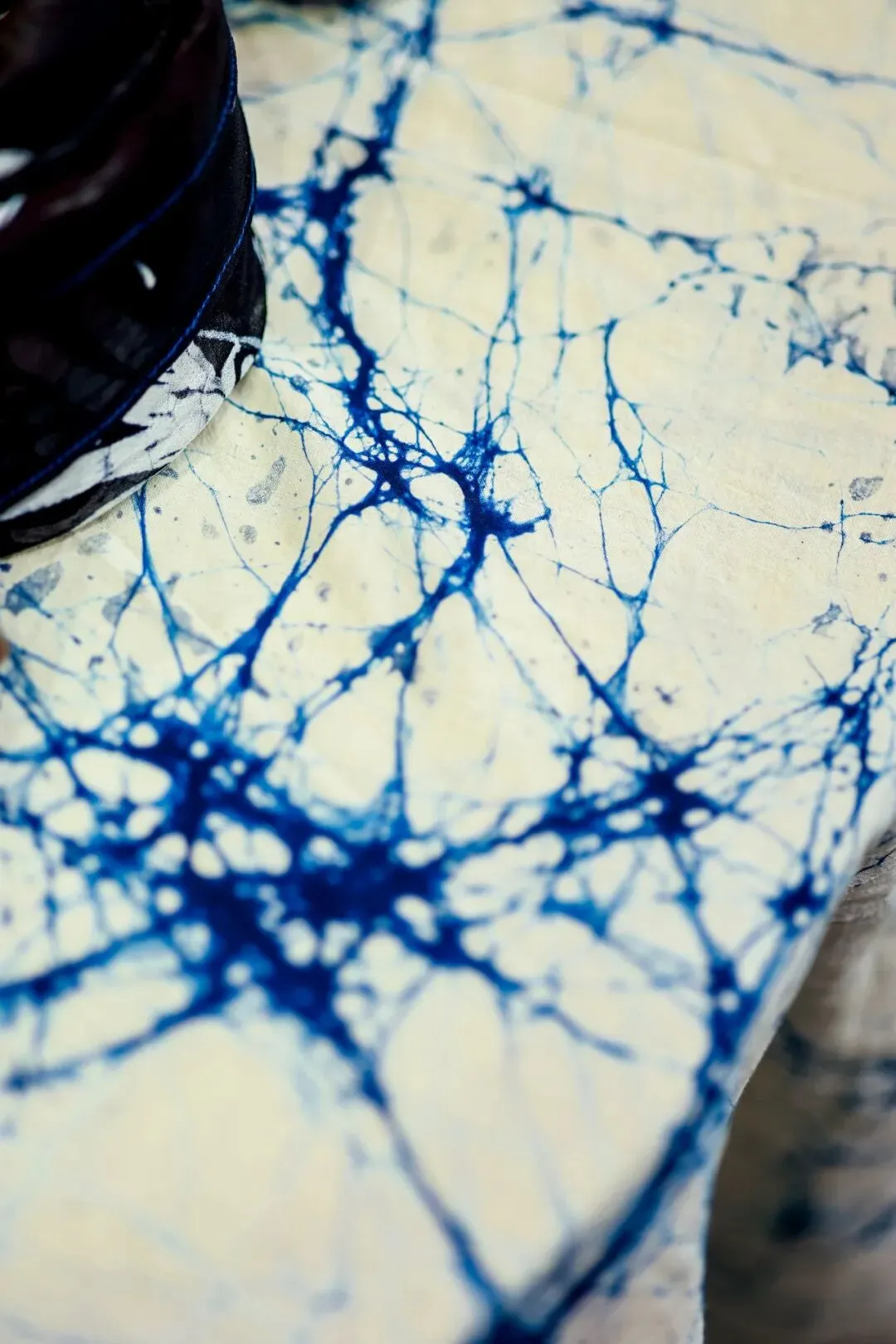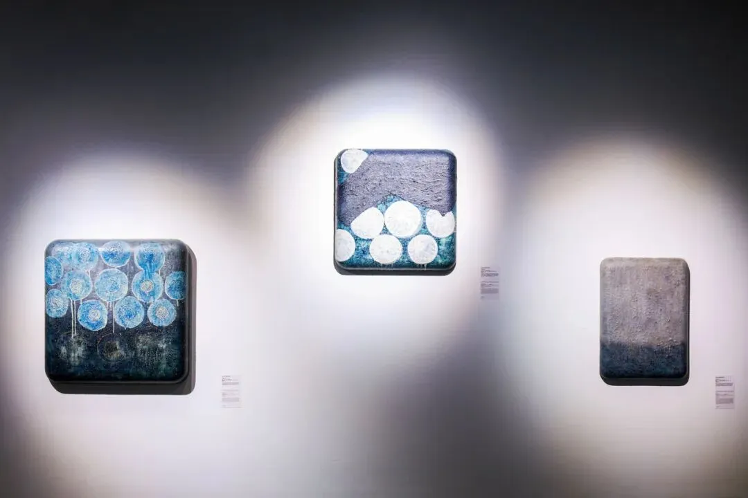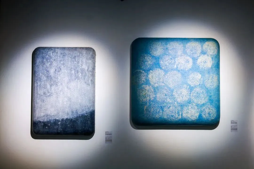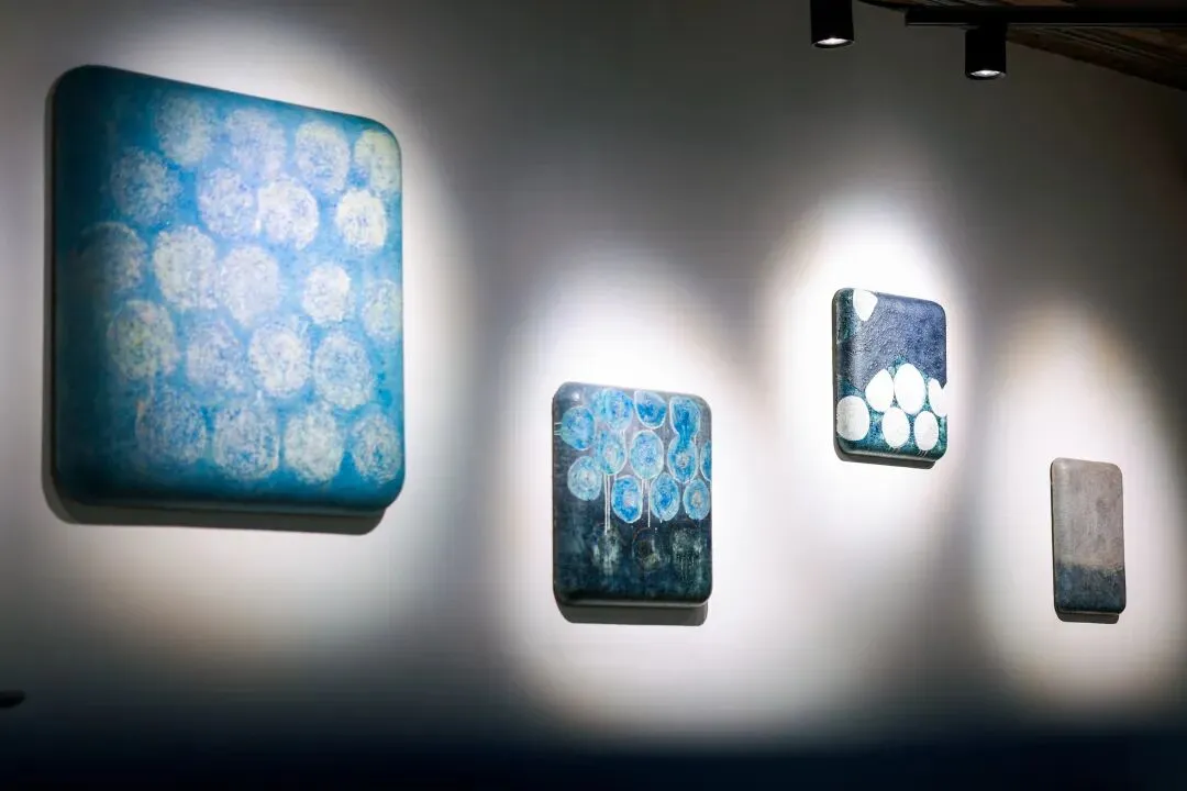 在形式语言上,作品巧妙融合了珊瑚化石的深浅肌理。一半沉降于岁月的厚土,一半绽放于时光的裂隙,纹样如同悬浮于天地间的花瓣,在蓝白交响中定格。画娘以蜡刀为笔,将女性的生命轨迹淬炼为一种纯粹的精神存在:这些纹样虽如化石般凝固了刹那的绽放,却展现出一种“不落凡尘”的空灵意境。