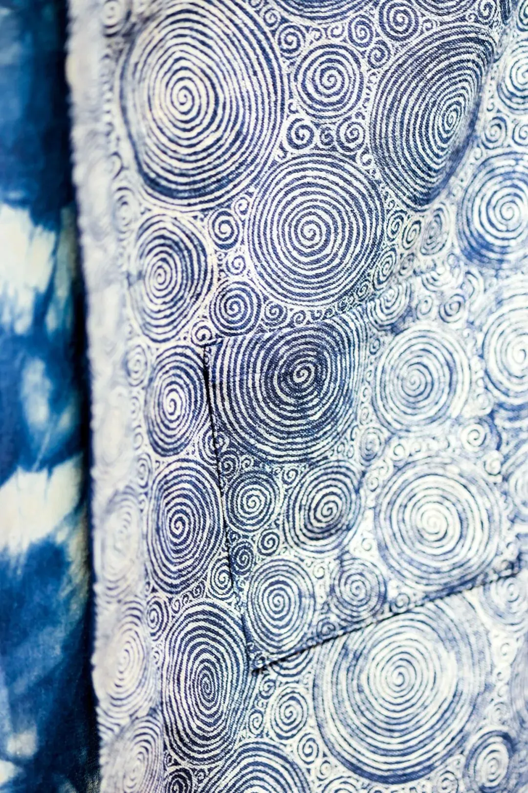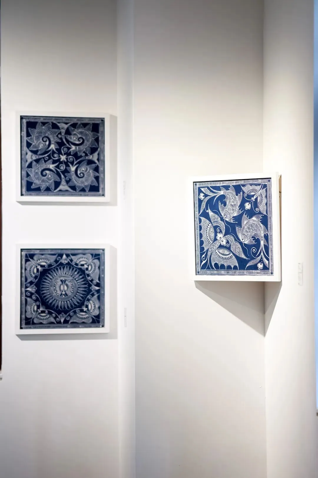 本次展览的核心亮点之一,是基于徐静《百花不落地》系列的视觉重构。作品以苗语“窝妥”(意为“蜡染的衣服”)中的螺旋图腾为精神内核——这一纹样锚定了苗族迁徙史中关于江河旋涡的集体记忆,其规整而循环的线条构筑出一部生生不息的视觉史诗。