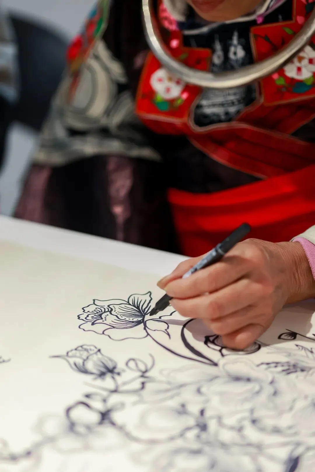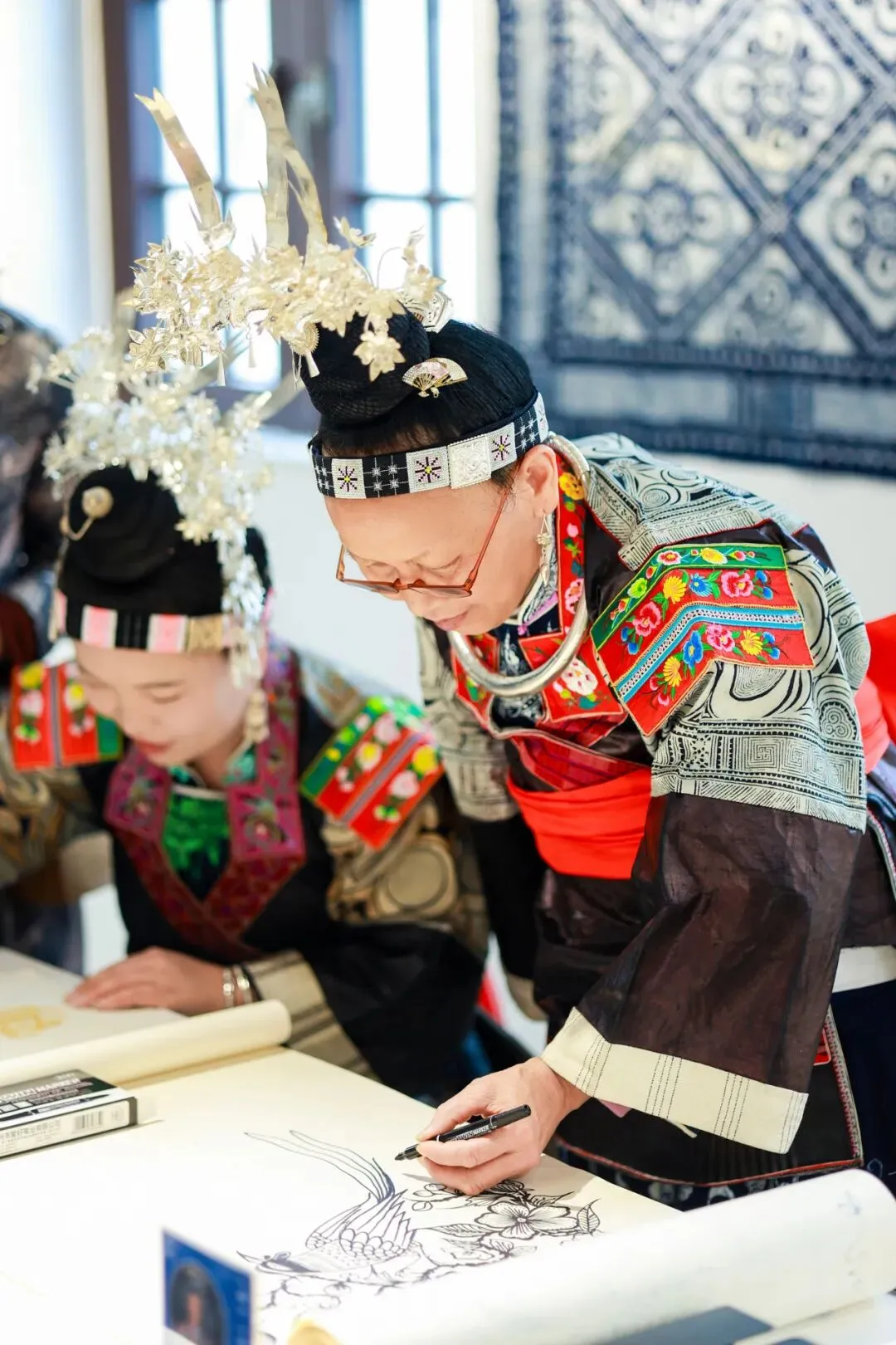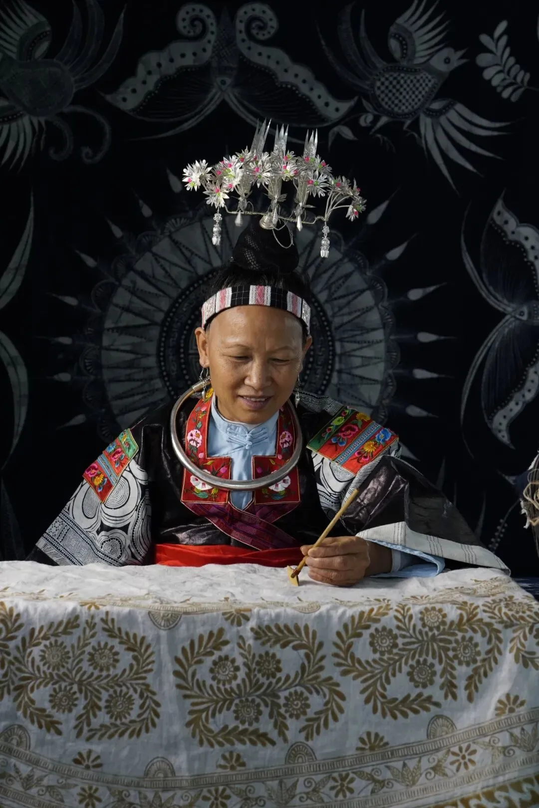 展览将源自黔东南深山的传统美学引入上海——在排莫苗寨的褶皱深处,画娘们以蜡刀为笔、蓝靛为墨,在素布上镌刻着流传千年的民族史诗。这群被誉为“原生艺术家”的画娘们,虽已步入花甲之年,却始终恪守“画蜡不画稿”的传统,以质朴的线条勾勒出苗族图腾的灵魂。