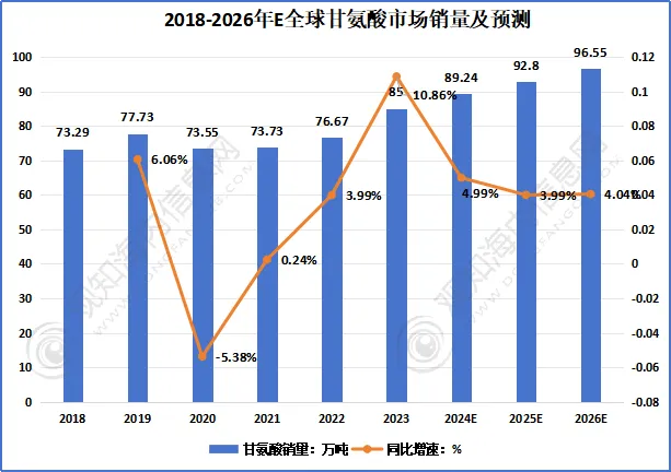 随着市场经济回温,行业预计2024 年中国食品级甘氨酸销量将达到 7.5 万吨,后续仍将保持增长态势,到 2026E 年有望攀升至 9.42 万吨。