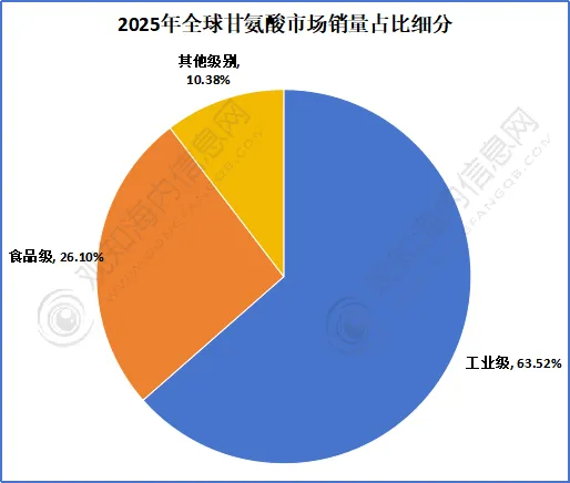 根据数据显示,全球甘氨酸市场销量工业级为主,占整体的63.52%,其次是食品级市场销量占整体的26.10%,其他级别及占市场销量的10.38%。