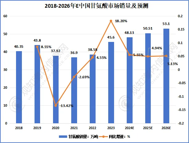 随着行业经济回温及下游需求持续释放,行业预测2024 年中国甘氨酸市场销量将突破 48 万吨,后续仍将保持稳步增长,2026E 年销量将升至53.1 万吨,行业整体呈现稳中有升的发展态势。