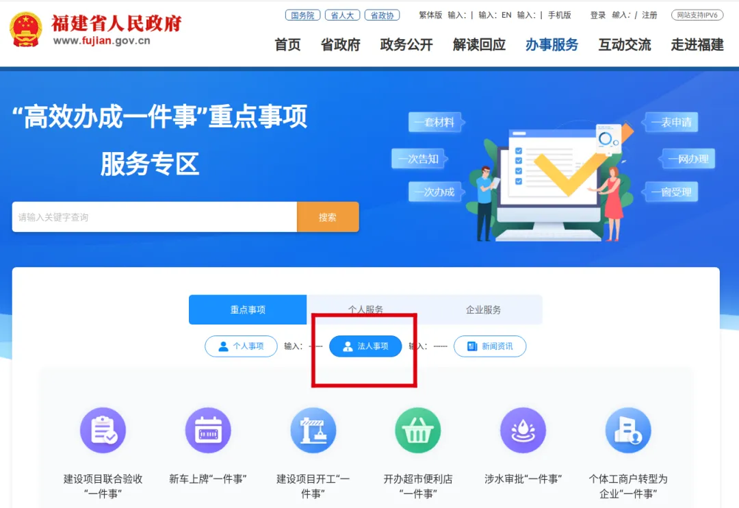 通过搜索“福建省网上办事大厅”或者直接访问福建省网上办事大厅网址:https://zwfw.fujian.gov.cn/,进入网站首页,点击办事服务类——“高效办成一件事”模块。