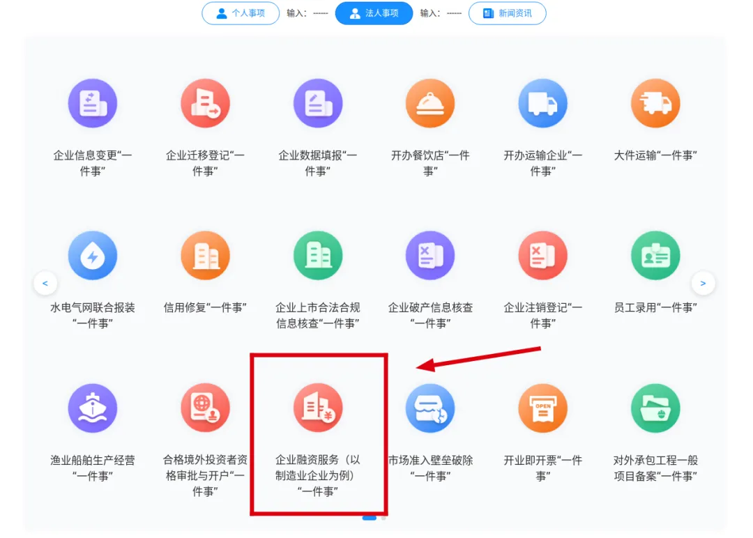 进入“高效办成一件事”重点事项服务专区页面,选择“法人服务”,点击法人服务中的企业融资服务(以制造业企业为例)“一件事”。