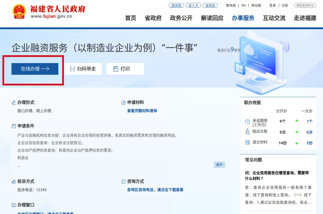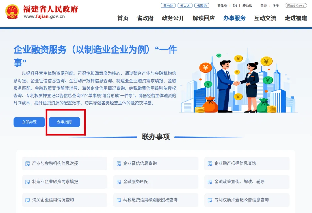 进入“企业融资服务(以制造业企业为例)‘一件事’”页面,点击“办事指南”,或“在线办理”。