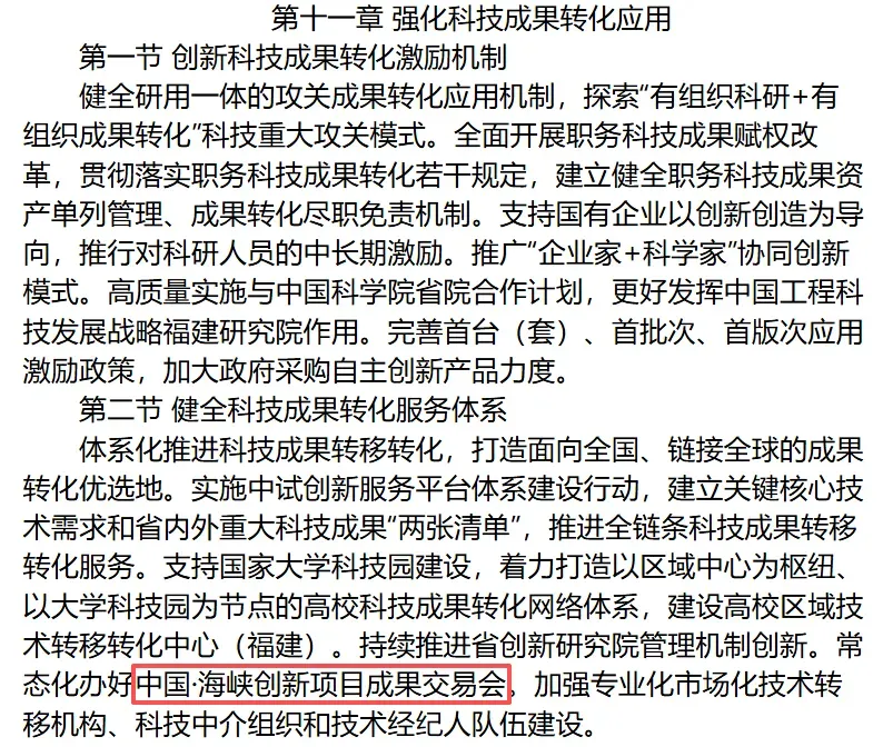 3月20日,《福建省国民经济和社会发展第十五个五年规划纲要》全文正式发布。该纲要第十一章“强化科技成果转化应用”明确提出,要常态化办好中国·海峡创新项目成果交易会,加强专业化市场化技术转移机构、科技中介组织以及技术经纪人队伍建设。