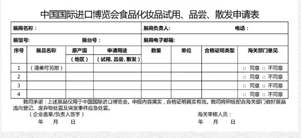 对于准备在进博会上试用、品尝、散发的展览用品,参展商应提前将预计的消耗,以书面形式告知上海海关,并明确展览用品拟使用方式和数量,应在合理范围内,与活动规模相匹配。对于拟试用、品尝、散发的展览用品,相关参展商应当具备符合要求的合格证明(参展国官方证书/第三方检测报告/参展方自验合格报告/参展方合格申明)。