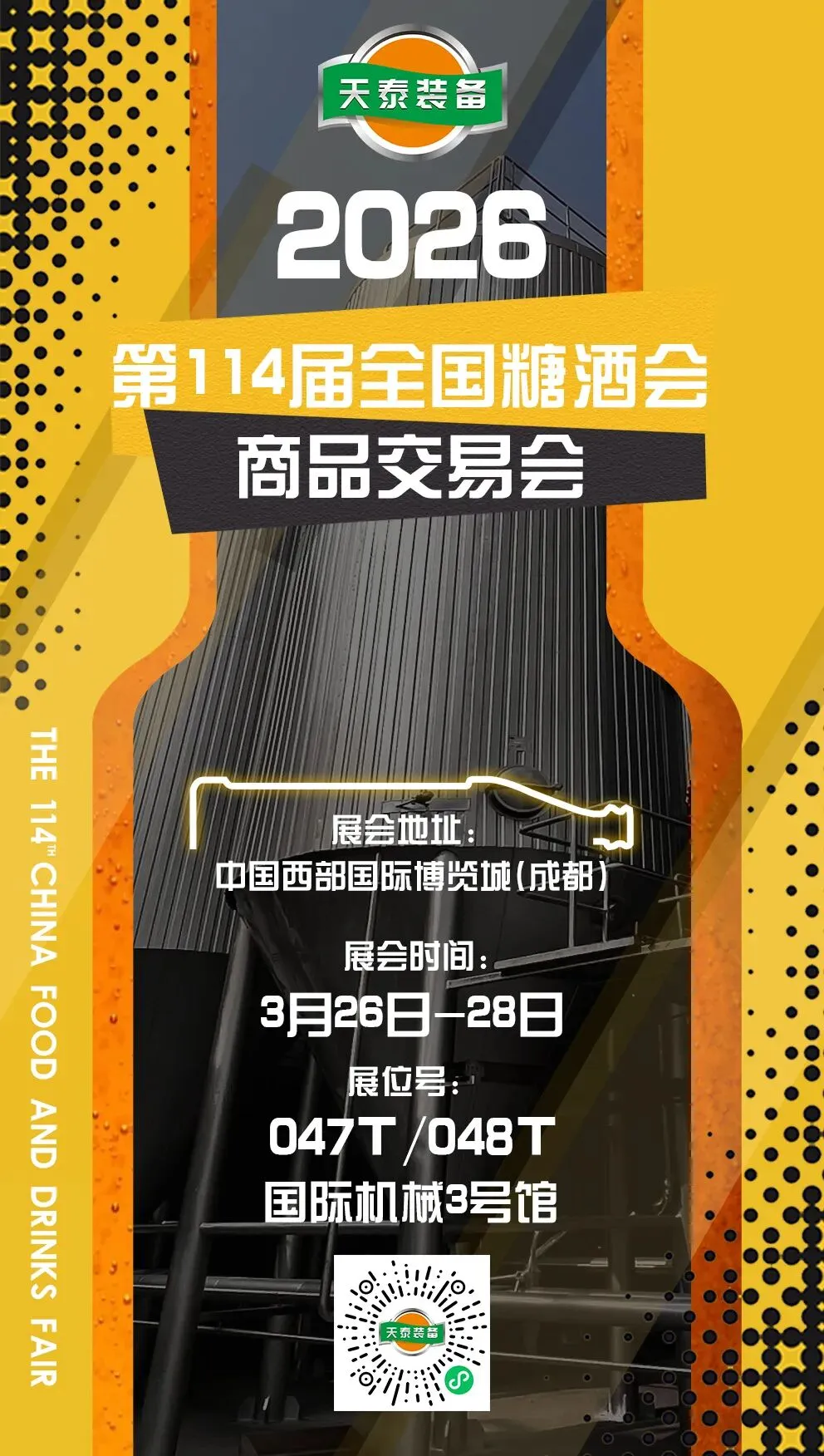 第114届全国糖酒商品交易会(2026成都糖酒会)即将盛大启幕,天泰设备诚邀您共赴这场行业盛会!本次展会于成都中国西部国际博览城举办。我们精心筹备设有两个展位,天泰的展位在国际机械3好馆047T/048T。届时,我们将展示最新产品与技术,期待与您深入交流,共探行业发展新机遇。