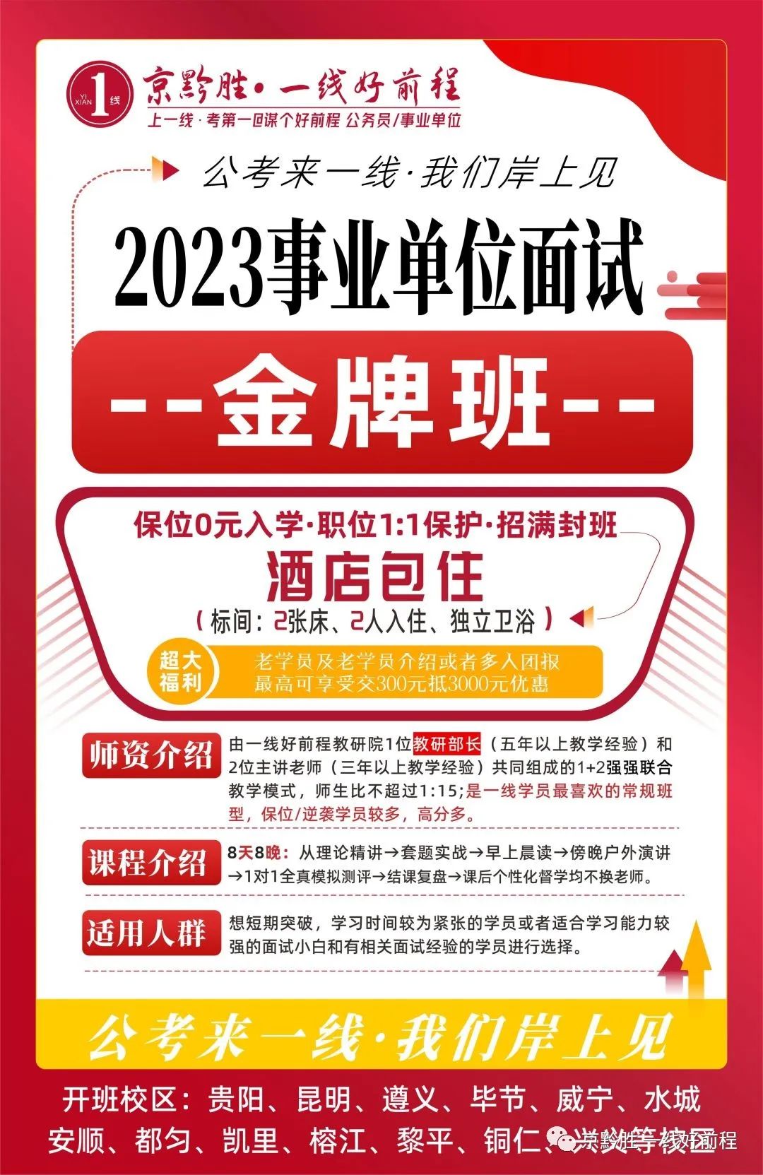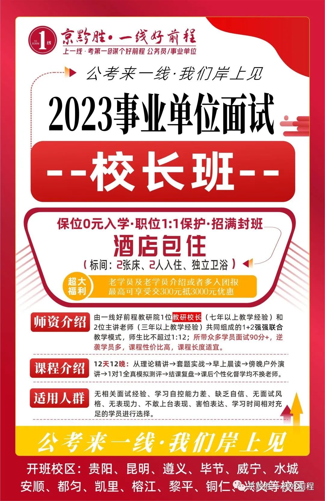 由一线好前程教育集团面试教研院1位教研部长(五年以上授课经验)和2位主讲老师(三年以上授课经验)共同组成的1+2三师强强联合教学模式,师生比不超过1:15;是一线好前程学员最喜欢的常规班、保位和逆袭较多、高分多、考区第一或考场第一多。