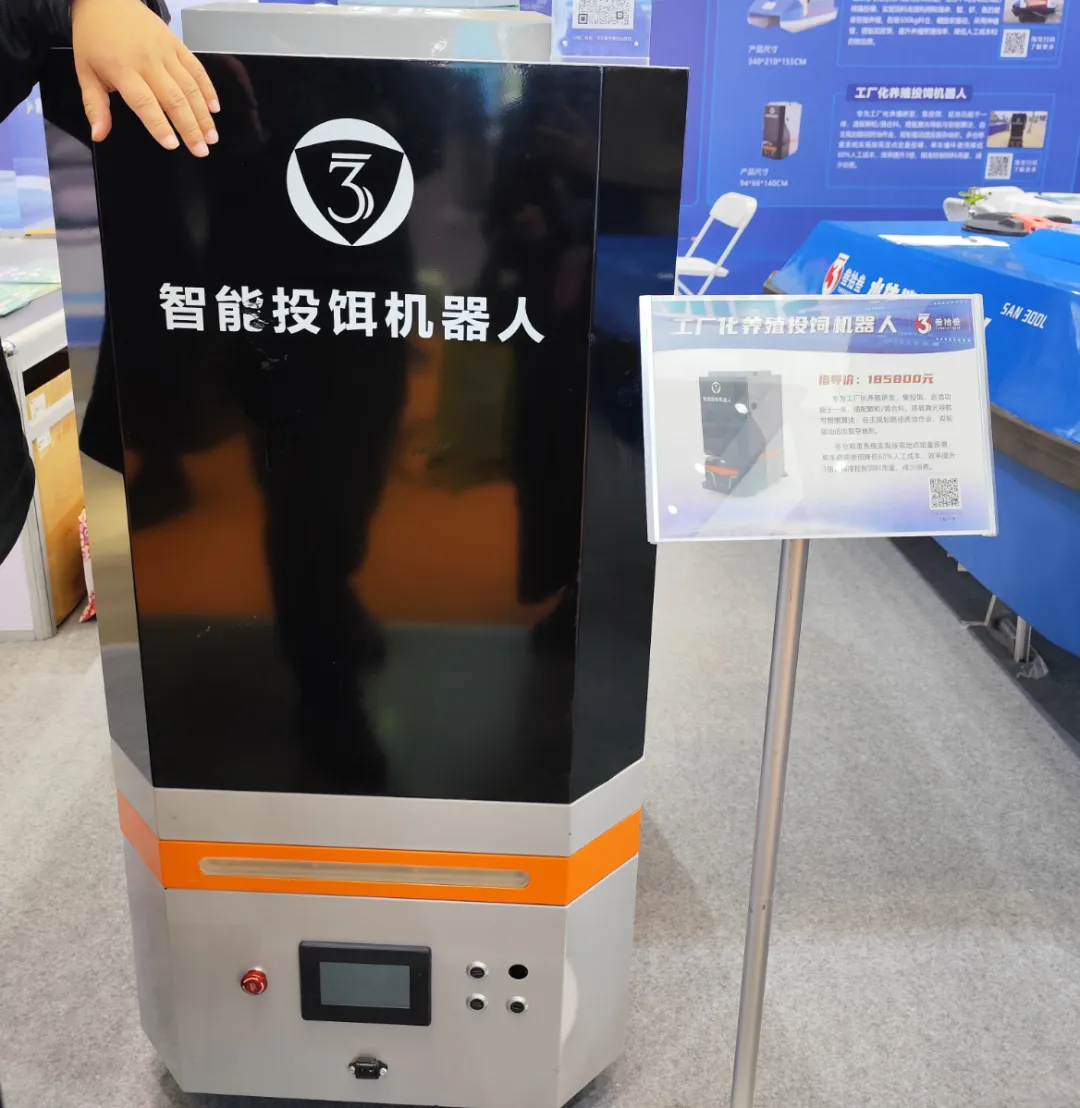 此外,在本次设备馆上,还有叁拾叁带来的工厂化养殖投饲机器人。据了解,这款机器人集投饵、巡池功能于一体,搭载激光导航与智能算法,可自主规划路径实现跨池作业。“机器人具体防倒设计,单体料仓最大达120斤,可根据不同塘口内的饲养鱼种、生长阶段、饲料类型和环境变化自动作出养殖策略和执行方案。”该公司在展位上的负责人表示。