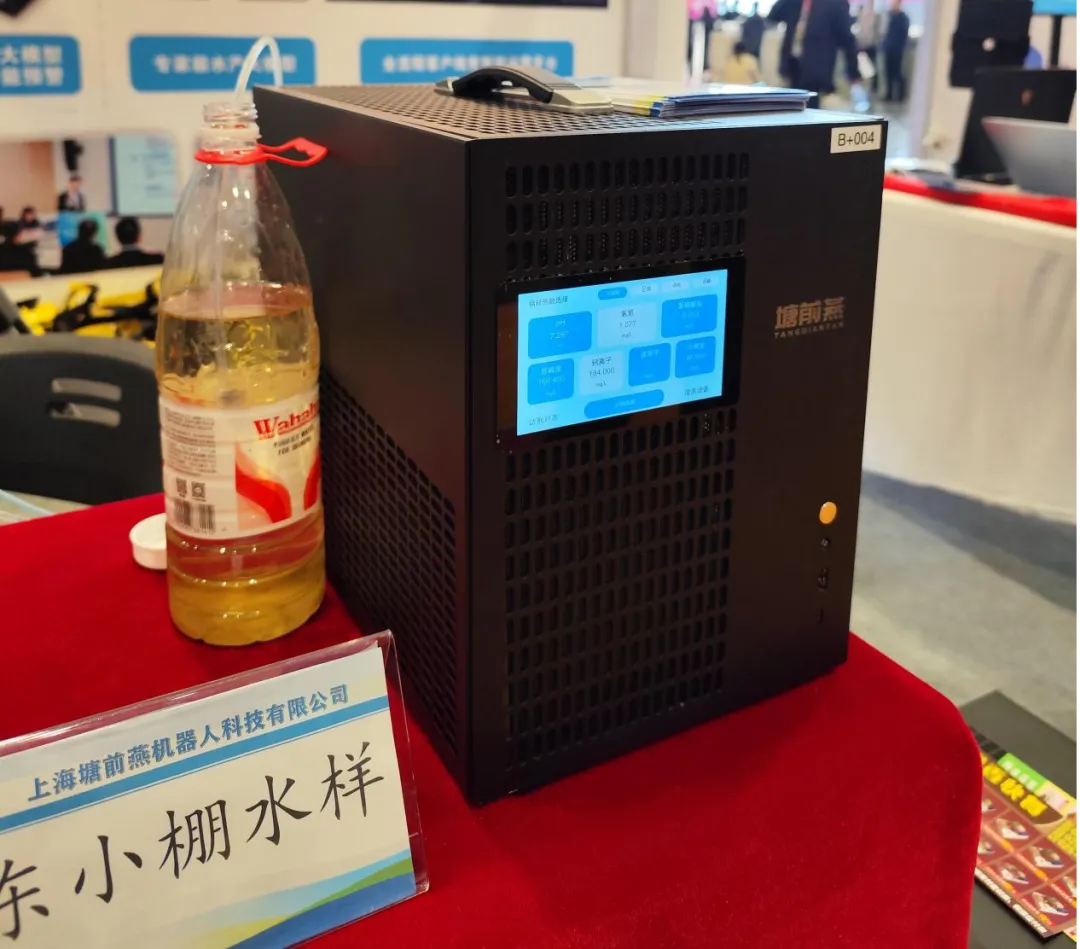 上海塘前燕机器人科技有限公司在水质分析仪上加入自主研发的AI大模型智能体。展位的其中一位工作人员介绍,将水质分析仪的测试管连上要测试的水体,直接点击屏幕中想要检测的水质选项,如pH/氨氮/亚硝酸盐氮/钙离子/镁离子/总硬度/总碱度等即可,系统会自动解读并分析水质指标。检测结果会永久存档。