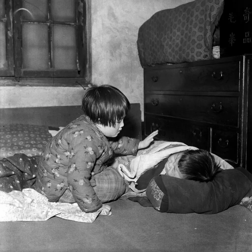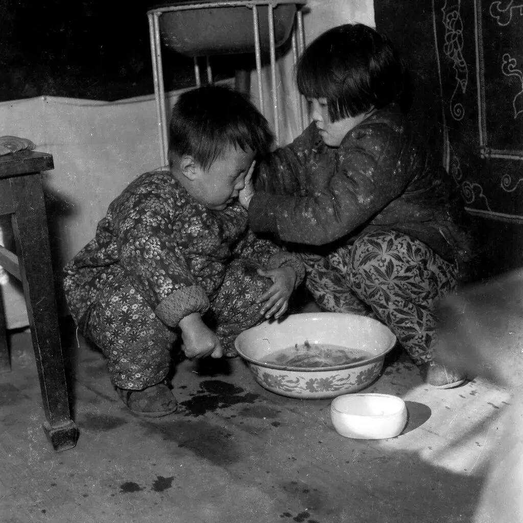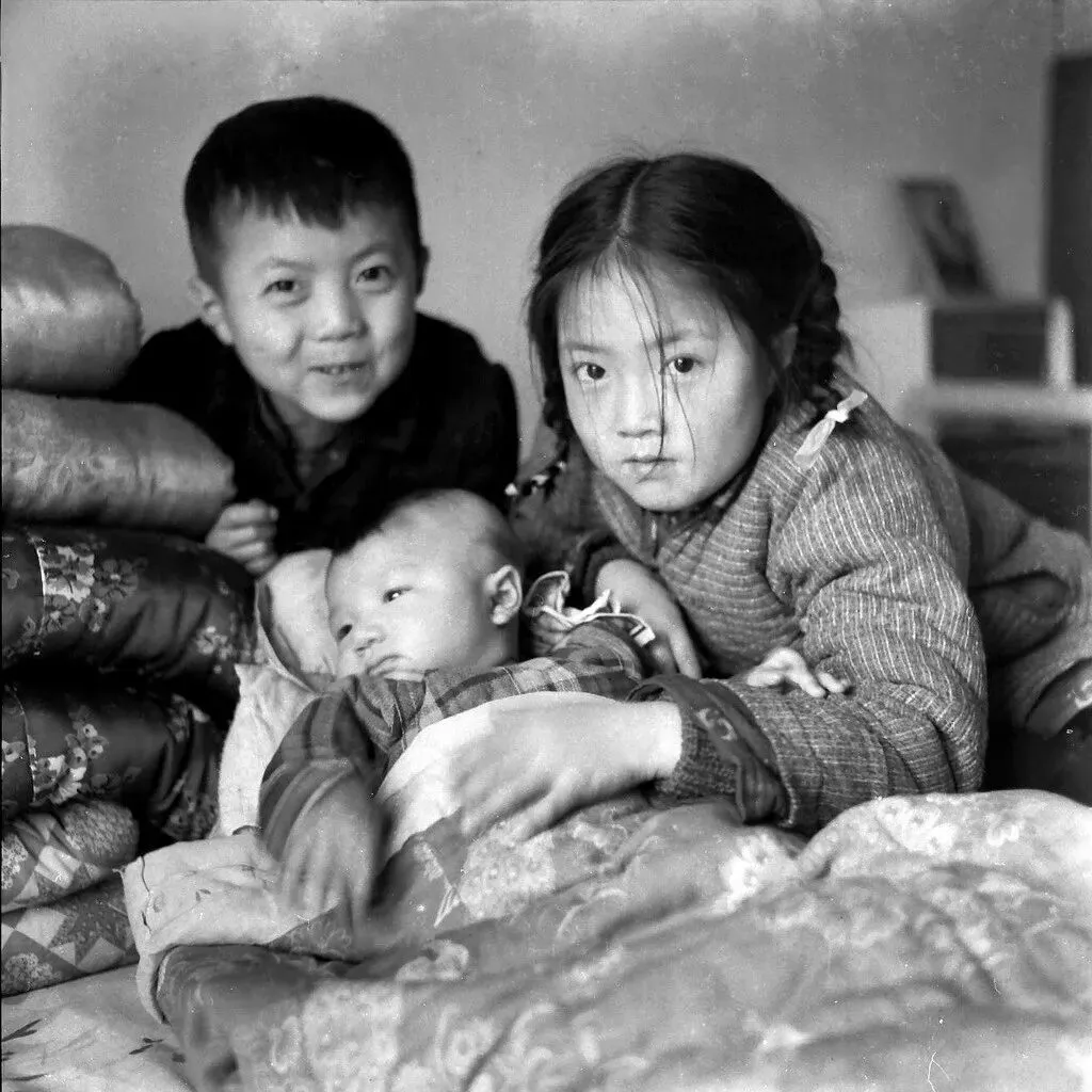 1963年,我的女儿和大儿子在沈阳家中看护弟弟。