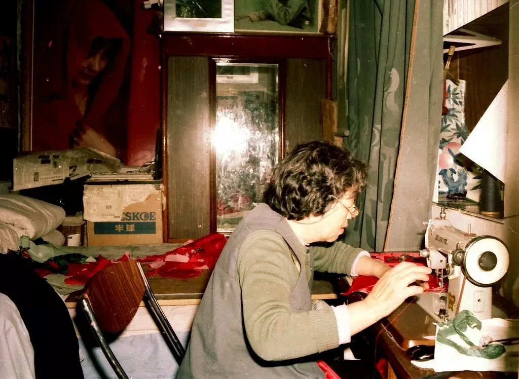 1997年,我的妻子在马路湾的家中做缝纫活。