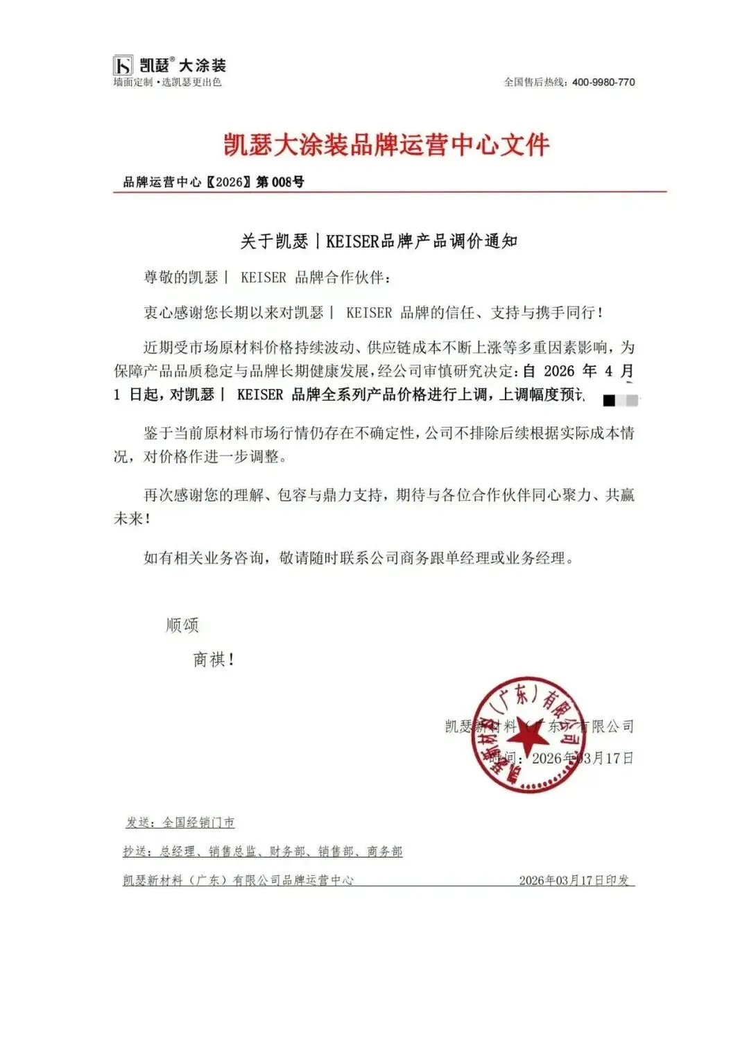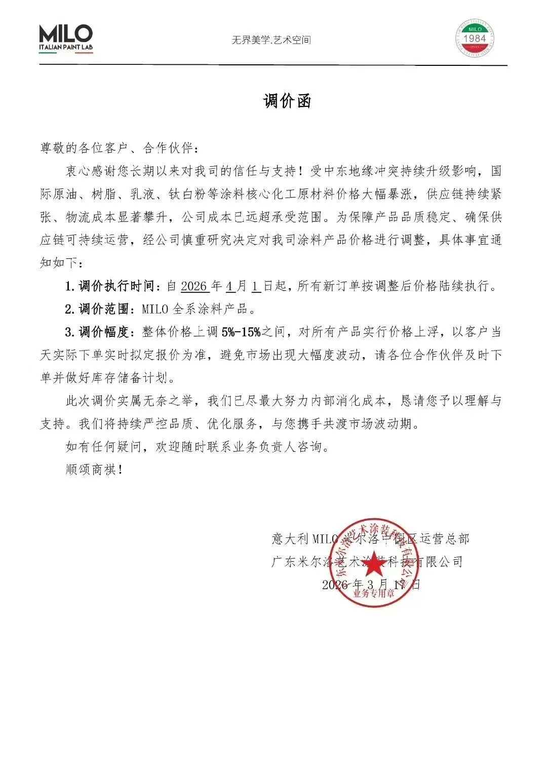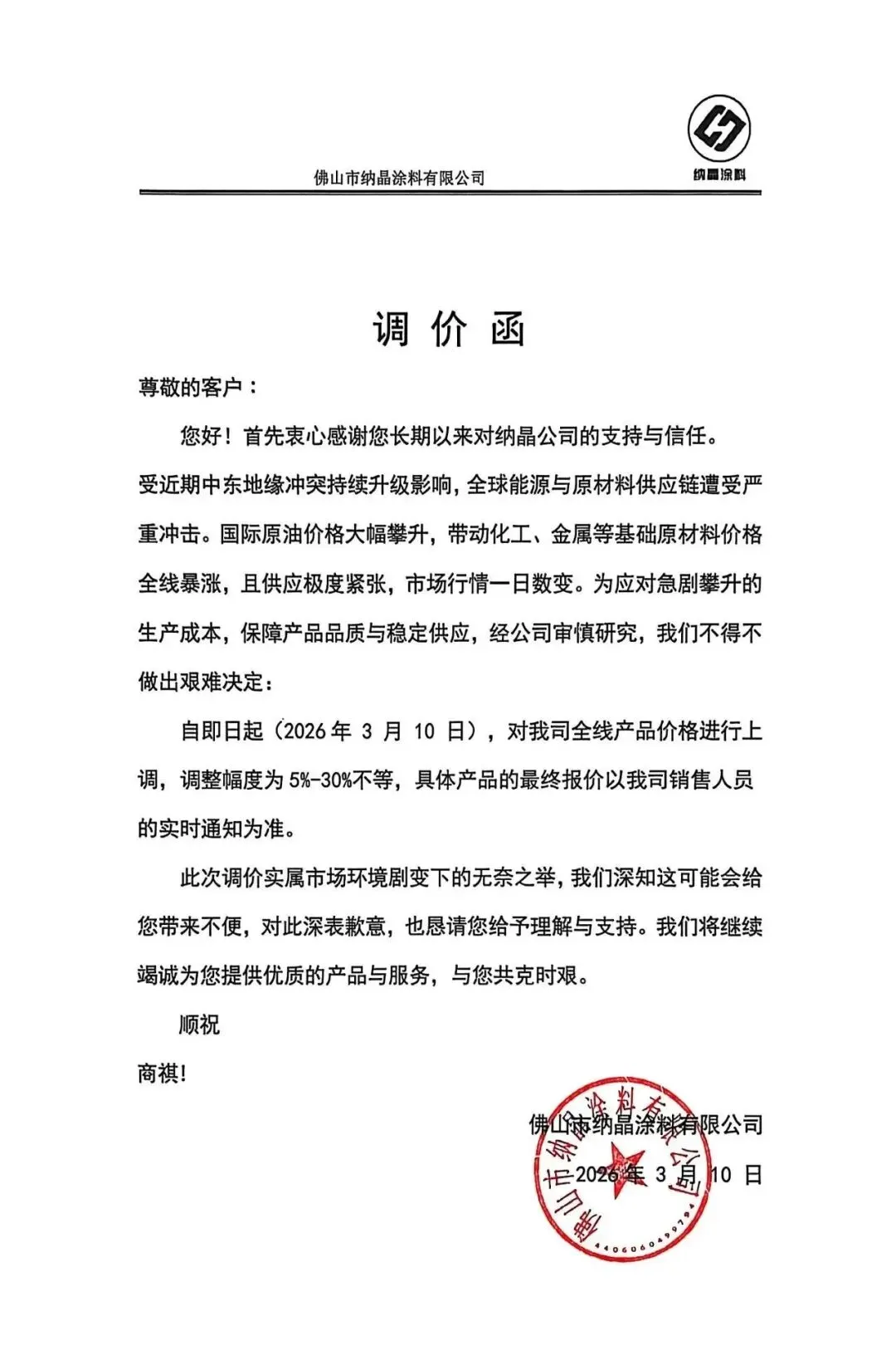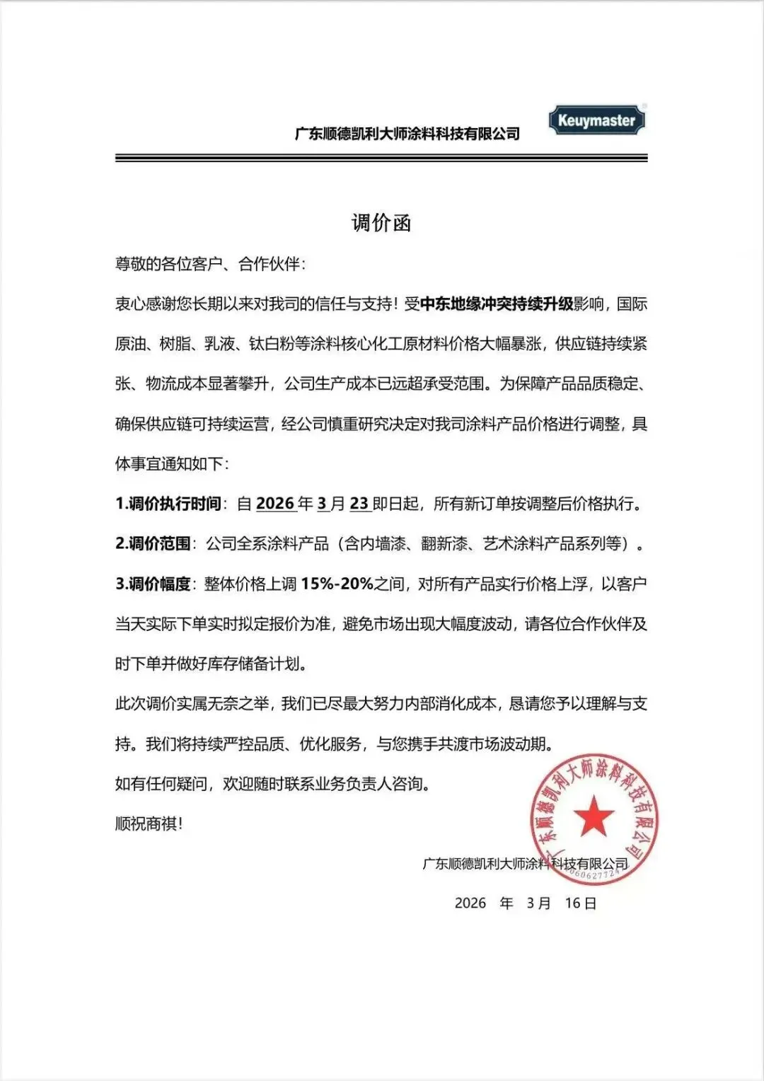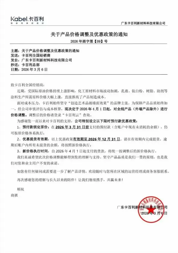 涂赢天下讯:近日,艺术涂料行业迎来调价潮,美涂士、纳晶、宏燕、凯瑟、凯利大师、卡百利、米尔洛、顶新等八家企业陆续发布涨价通知。