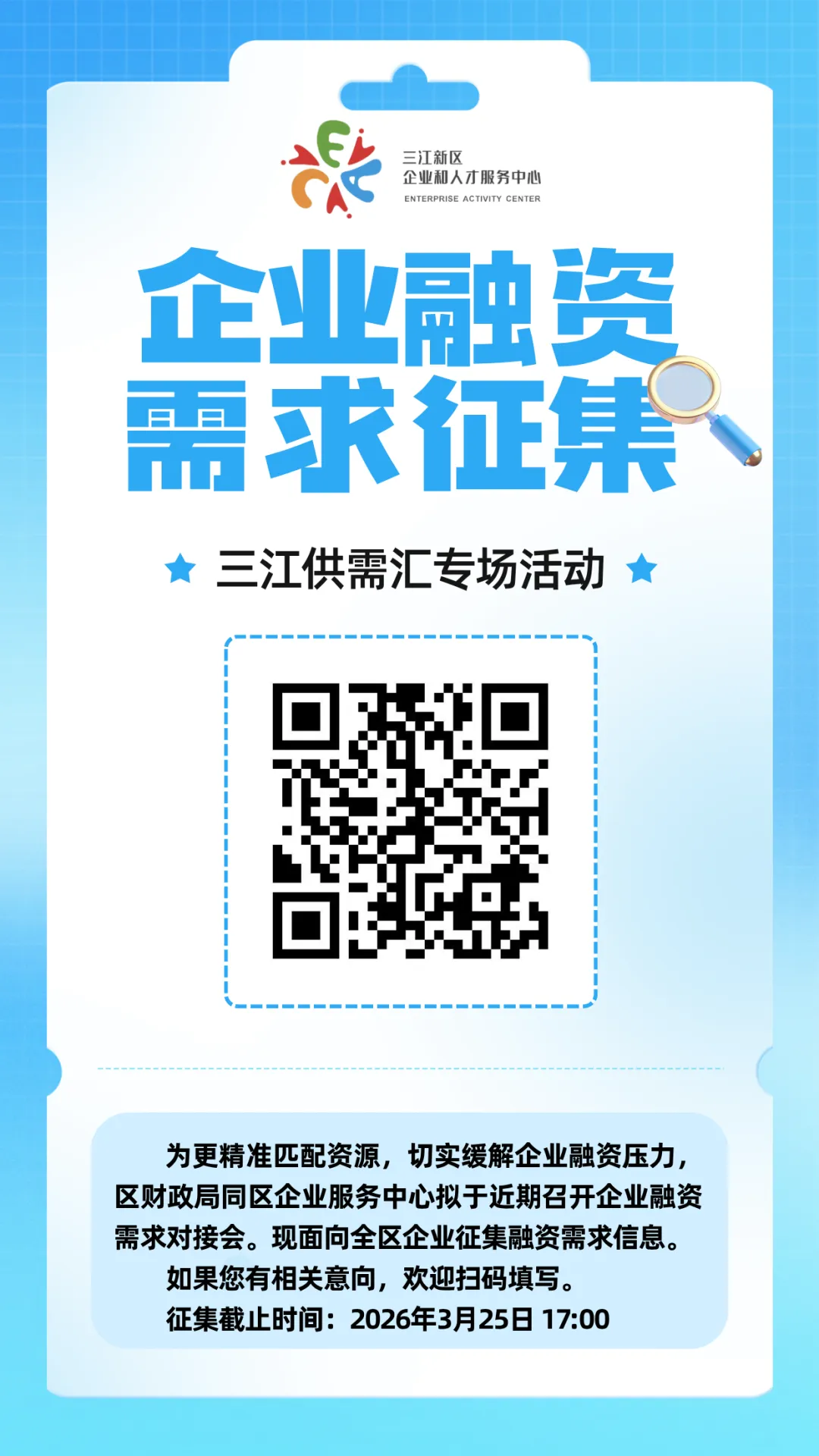 为精准对接资源,缓解企业融资压力,三江新区“三江供需汇——政企银担对接”专场活动即将启动!现面向全区企业征集融资需求信息,诚邀有相关意向的企业积极参与。
