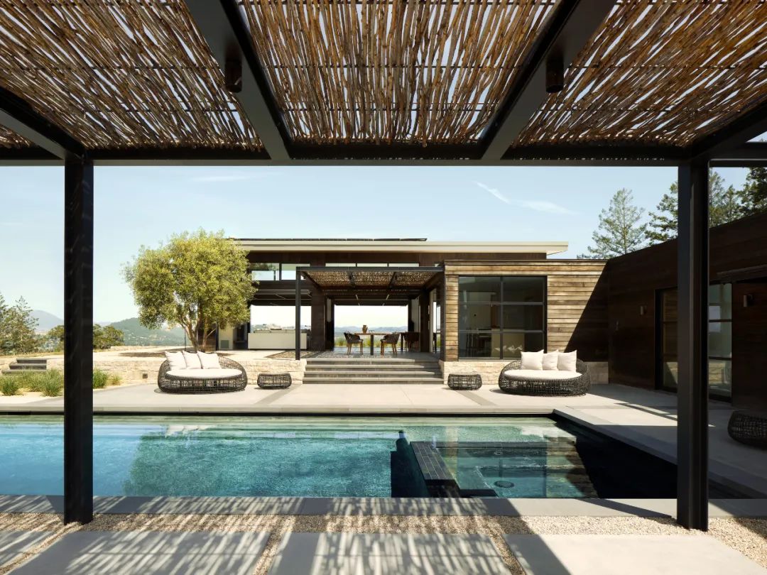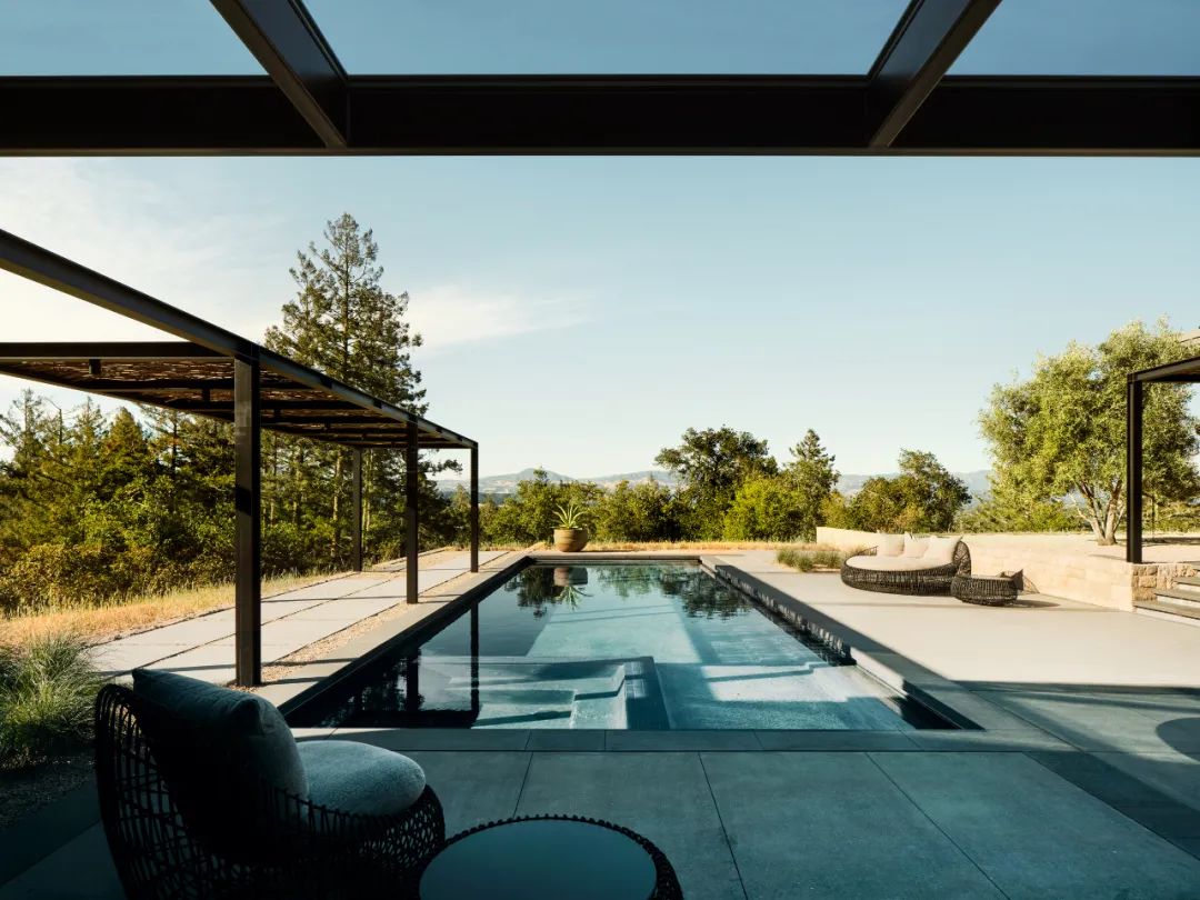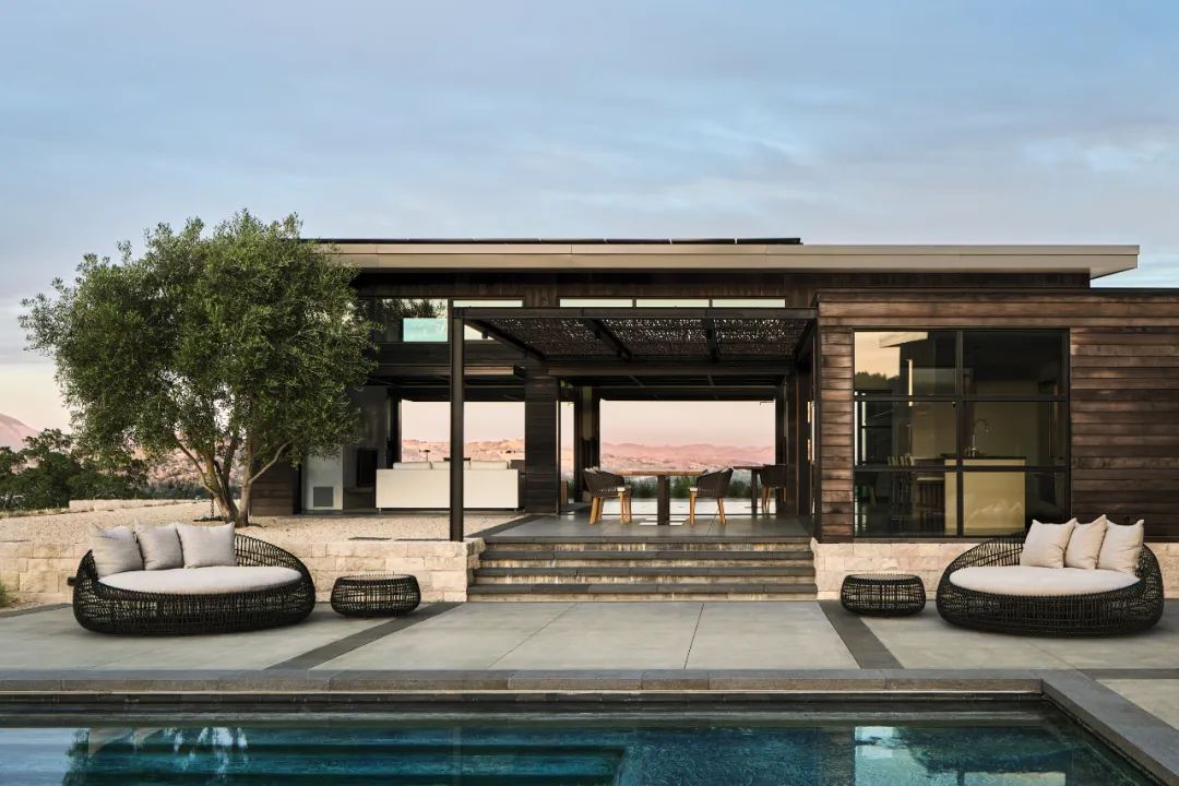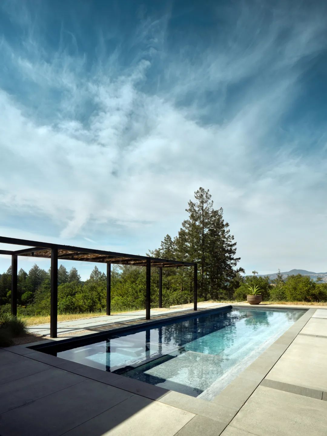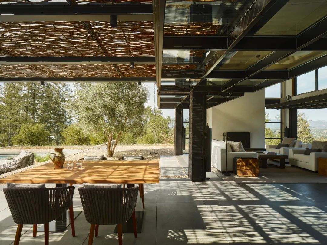 住宅向东侧扩展,插入了一个更新的、隐蔽的主套房,俯瞰着谷底和远山的广阔景色,新的扩建部分完美地与原有部分融合为一个优雅的整体。一个为休闲娱乐和家庭用餐而设计的新厨房坐落在公共和私密部分之间的十字路口,延伸到户外生活、餐饮和游泳池空间。