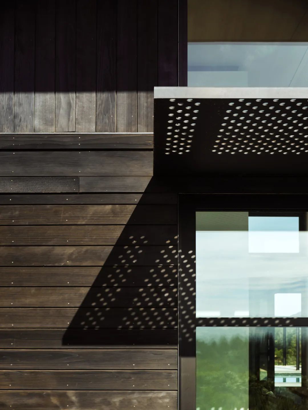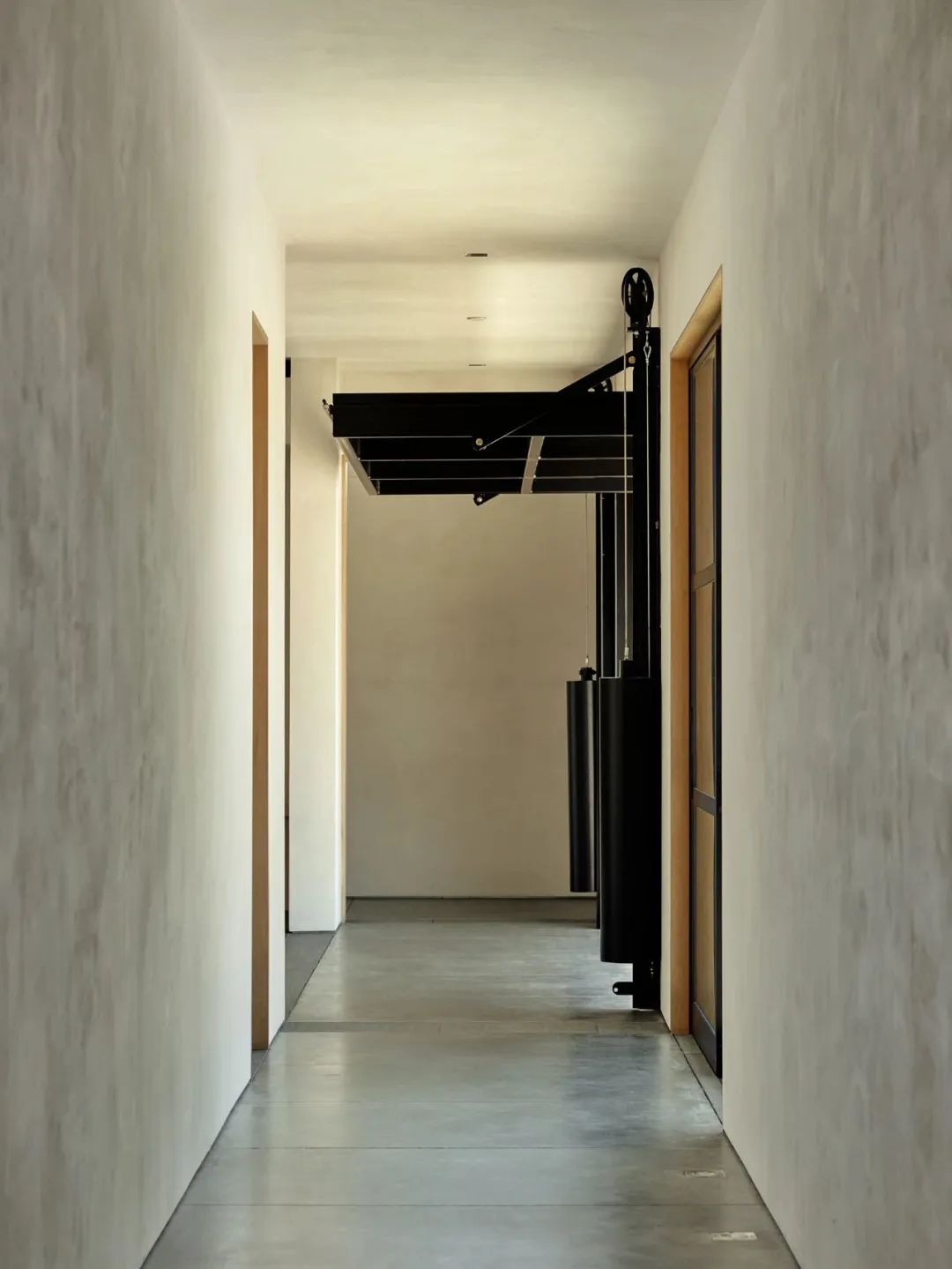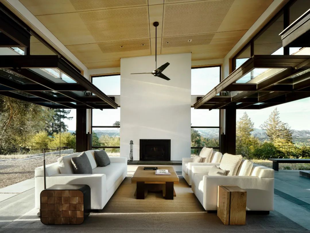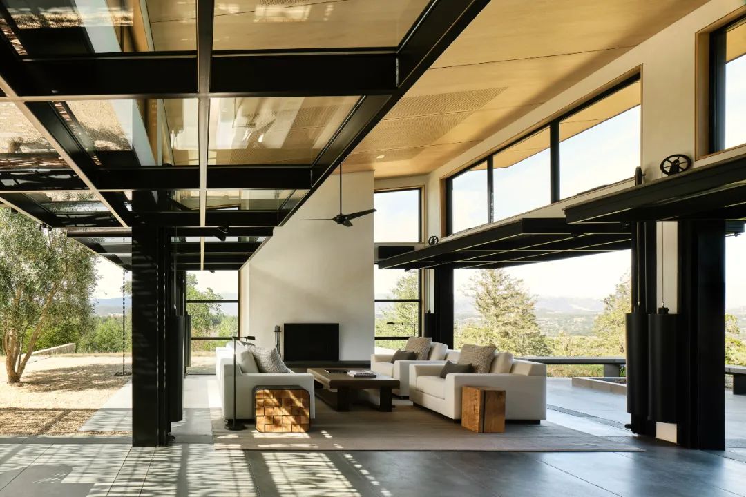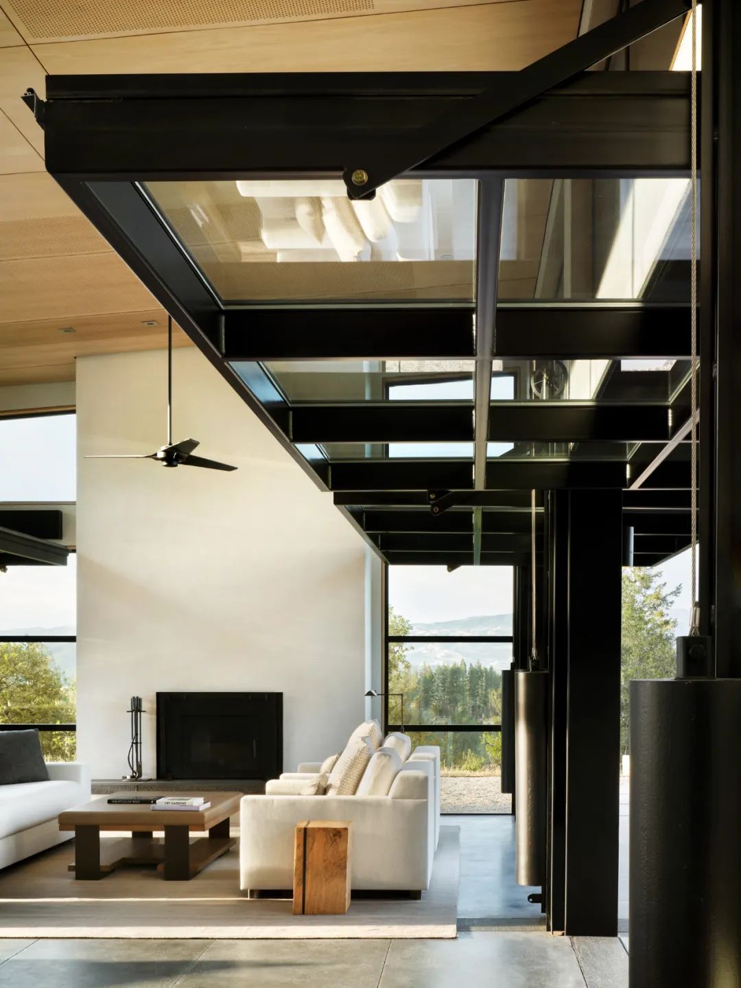 住宅的公共侧楼沿着山脊延伸,在高高的天花板和简单的棚式悬垂屋顶下有一个大房间,享有各个方向的景观视野,从早到晚都有充足的光线。