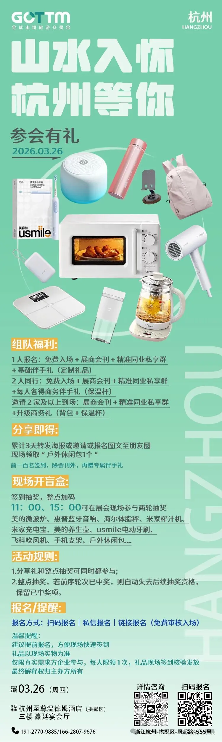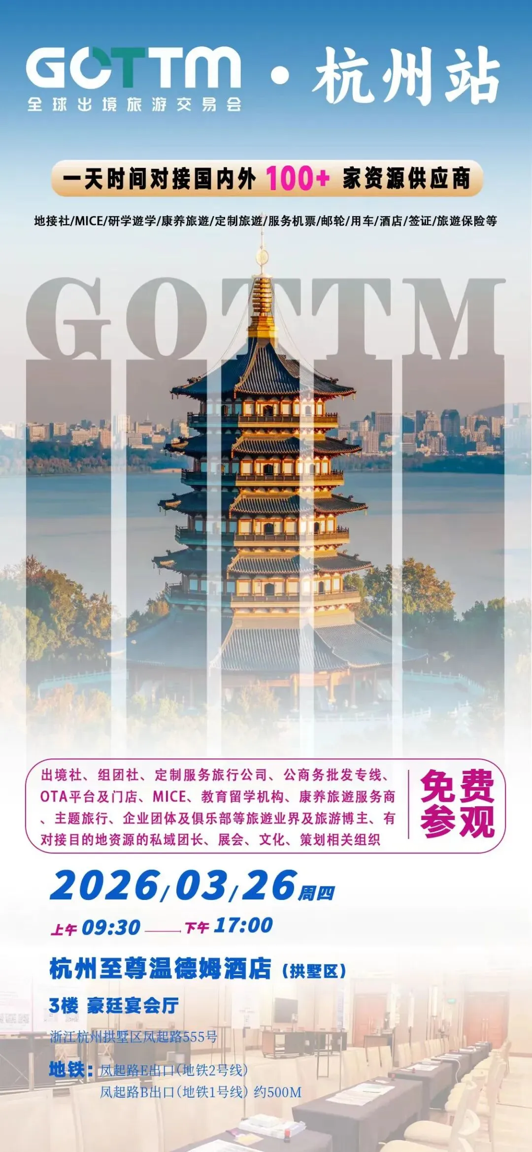 2026年3月26日,GOTTM全球出境旅游交易会将在杭州至尊温德姆酒店盛大启幕,邀你共赴一场文旅盛宴,更有超多惊喜福利等你来解锁!