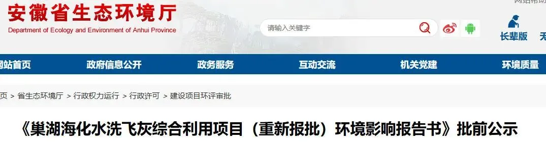 3月19日,安徽省生态环境厅对《巢湖海化水洗飞灰综合利用项目(重新报批)环境影响报告书》进行批前公示。该项目由巢湖海化环保科技有限责任公司负责建设,选址于合肥市巢湖市银屏镇巢湖海螺水泥厂现有厂区内。