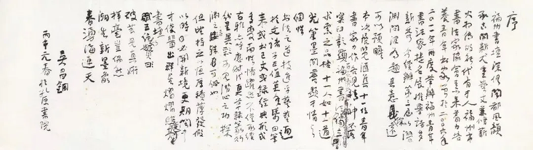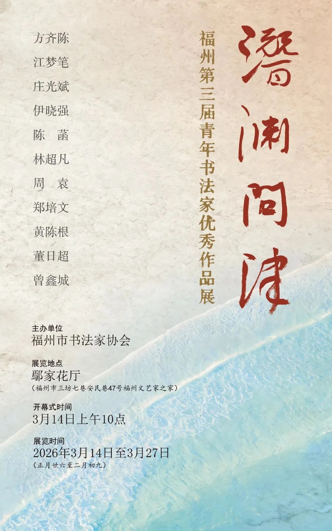 福州书坛深具闽都风韵,承古开新,尤重艺文兼修、薪火相传,故能代有才人。福州市书法家协会素来着力培养青年书家,曾于二〇〇六年、二〇一一年两度举办福州青年书法家提名展,推举诸多新秀。今续办第三届,以“潜渊问津”为题,其意深远,可以预瞻。