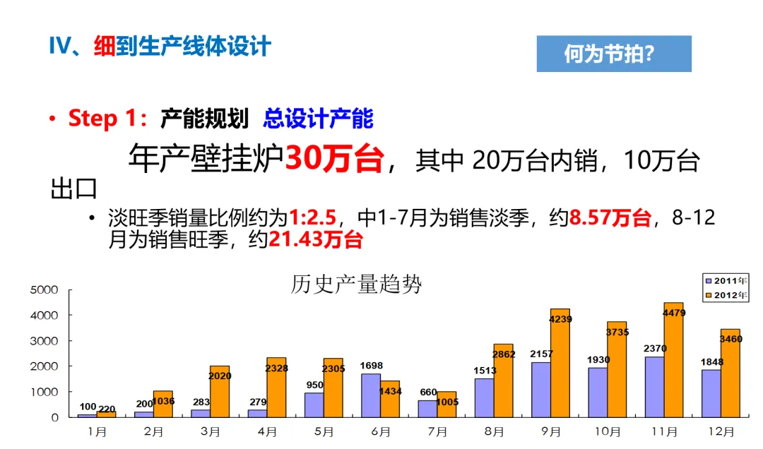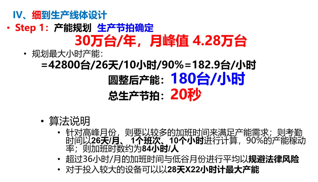 首先是。结合年产30万台(20万台内销、10万台出口)的目标,以及淡旺季1:2.5的销量差异,我们先确定核心节拍——旺季峰值月产能4.28万台,按26天/月、10小时/天、90%稼动率计算,锁定180台/小时的小时产能,对应20秒/台的总节拍,布局优化所有动作都围绕这个节拍展开。