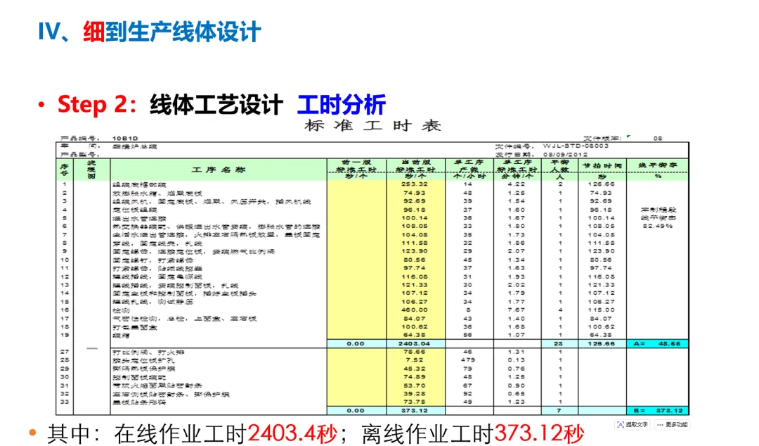 一是。将生产作业分为在线作业(2403.4秒)和离线作业(373.12秒),将离线作业(如部分零部件预装)转移至生产线外独立区域完成,不占用主线节拍。同时拆解每道在线工序的标准工时,对节拍超过20秒的瓶颈工序,通过增加工位、优化操作动作等方式调整,确保各工序节拍一致,避免出现“前松后紧”的卡顿问题。