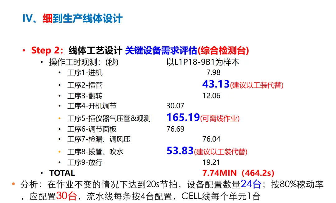 二是。以核心检测设备为例,单台检测需464.2秒,结合20秒/台的节拍,计算出需配置30台检测设备。我们将检测设备与生产线精准匹配:流水线每条配置4台检测台,紧跟装配工序,实现“装配—检测”无缝衔接;CELL线每个单元配置1台检测台,满足小批量生产的检测需求。同时,将插管、拔管等耗时工序的工装设备,就近布局在对应工位,用工装替代人工,进一步提升效率。