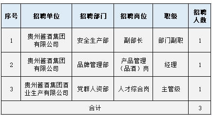 贵州酱酒集团及子公司本次面向社会公开招聘3人:
