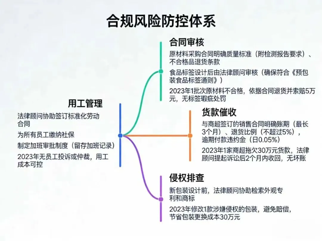 ·合同审核:原材料采购合同明确质量标准(附检测报告要求)、不合格品退货条款,食品标签设计后由法律顾问审核(确保符合《预包装食品标签通则》);2023年1批次原材料不合格,依据合同退货并索赔5万元,无标签瑕疵处罚。