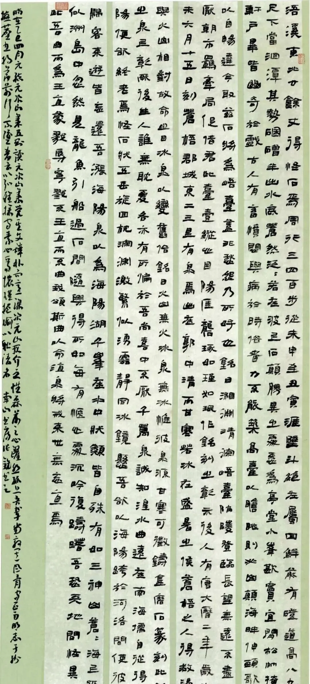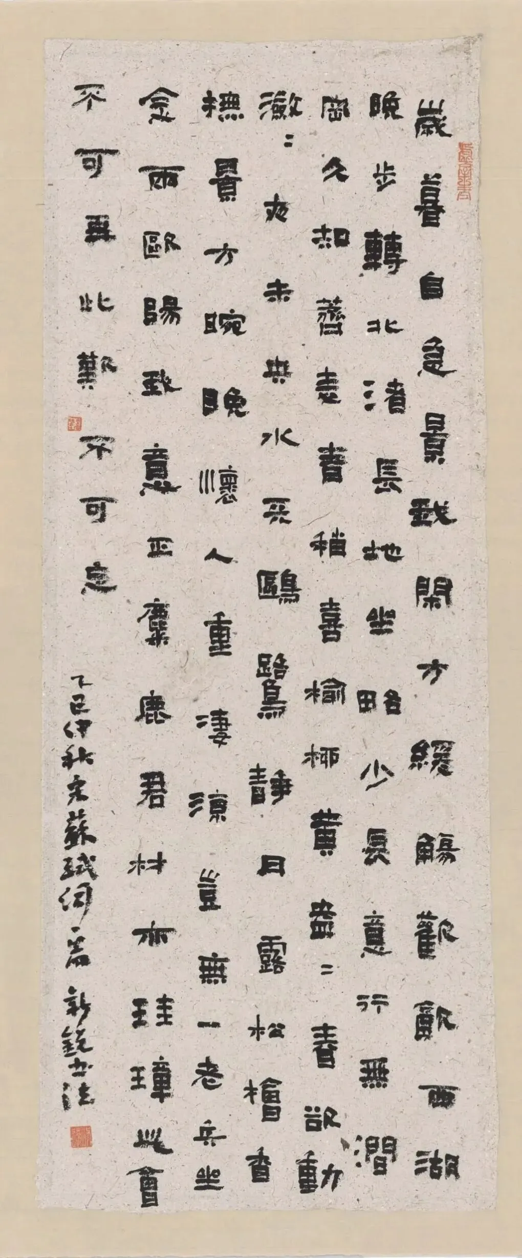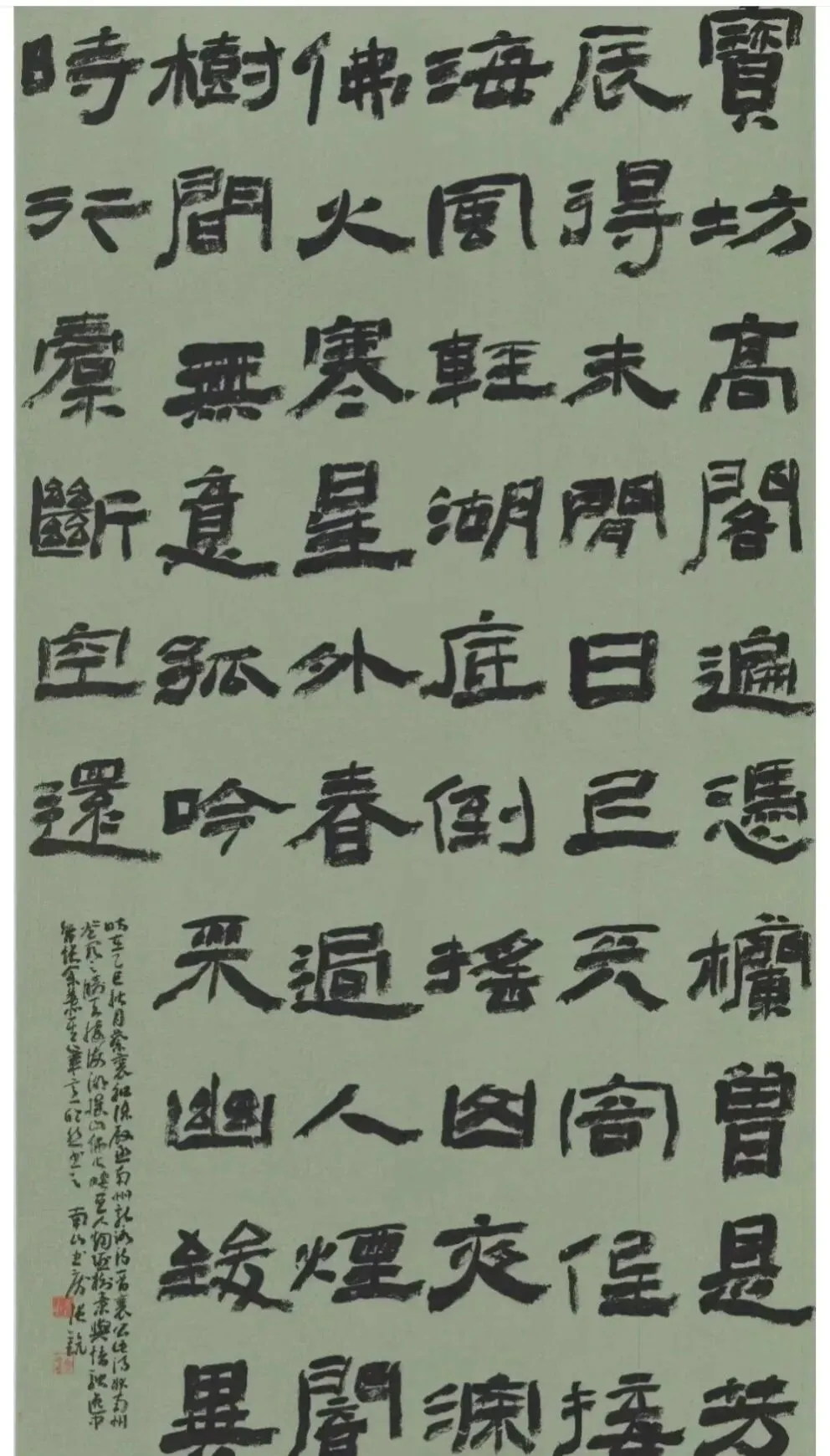 对于学习者而言,这种呈现方式的价值在于极高的可还原性。你可以清晰地看到,古雅的隶书笔意如何被安置在现代的展览尺幅中;经典的碑帖韵味,如何通过块面的对比、行列的错落、墨色的变化,被转化为具有强烈视觉张力的当代画面。它解答了一个核心问题:好的笔法,最终应该如何被“放置”才能成就一件好的作品。