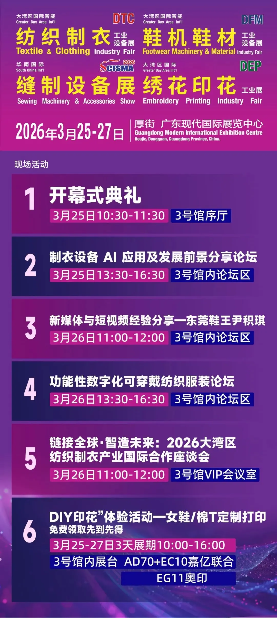 3月25 - 27日,在东莞厚街广东现代国际展览中心,「第25届大湾区国际智能纺织制衣工业设备展」「华南国际缝制设备展」「大湾区国际绣花印花工业展」「第25届大湾区国际智能鞋机鞋材工业技术展」将联动开启。届时,500多个全球品牌齐聚一堂,海量首发新品惊艳亮相。这是一场聚焦智造领域的行业盛会,汇聚前沿技术与创新成果,诚邀各界人士共赴盛宴,共探行业发展新机遇。