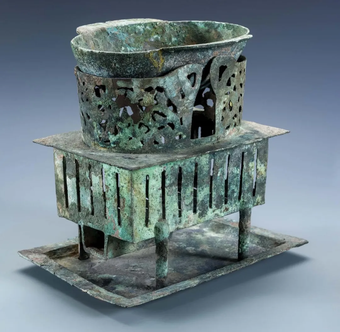 1965年广州市越秀区省物质厅工地M1出土。由上至下分为耳杯、炉、承盘三个部分,这样成套保存的染炉非常少见。染炉上部为镂空椭圆形支架以承托耳杯,下部为格栅式长方形炉身,炉外底设计有长方形鋆腔,供插柄手持,铸造工艺精湛,结构简约精巧,满足多种使用场景,具有典型的时代特征和科技巧思。同墓出土大批青铜器,凸显墓主人身份高贵,该炉为匹配墓主人身份的珍贵之物。经科学检测判断,该炉铜料来源于本地,属于本地生产制作的铜器,为研究岭南青铜器的原料和制作工艺等提供重要资料,是研究西汉南越国饮食方式、岭南青铜器制作使用及汉代多民族一体化进程的代表性实物。