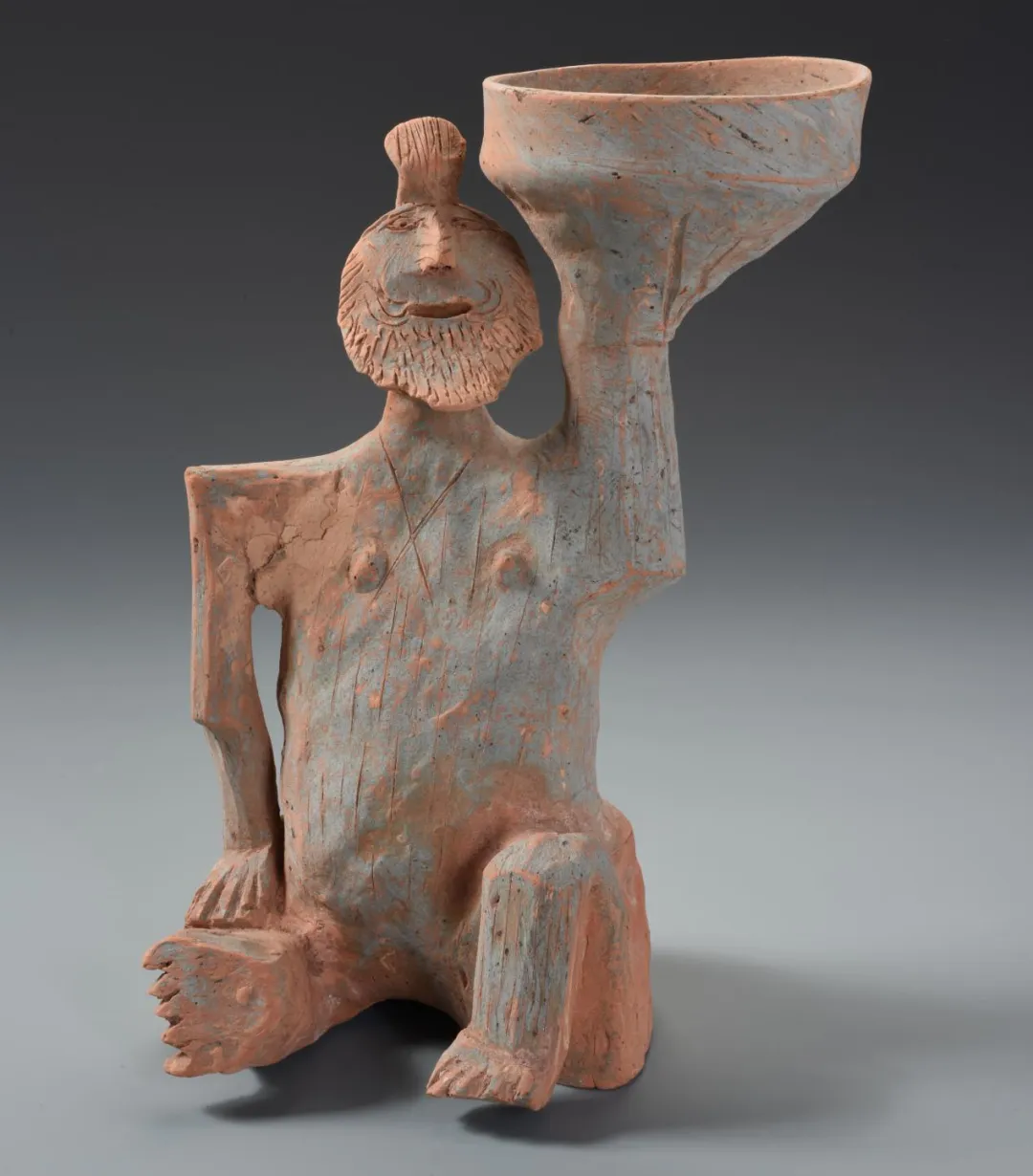 1999年广州市越秀区先烈南路大宝岗M5出土。俑塑出胡人脸形,头发束于脑后折向前成髻。曲膝坐地,左腿竖曲,右腿横曲,跣足。左手举托灯盏,右手垂直按于右腿上。颈下刻划X线纹显示身披交襟薄衫。时代及地域特征显明,造型独特,胡人四肢、五官刻划生动形象,是研究西汉岭南地区陶器制作使用及中外交流的重要实物。