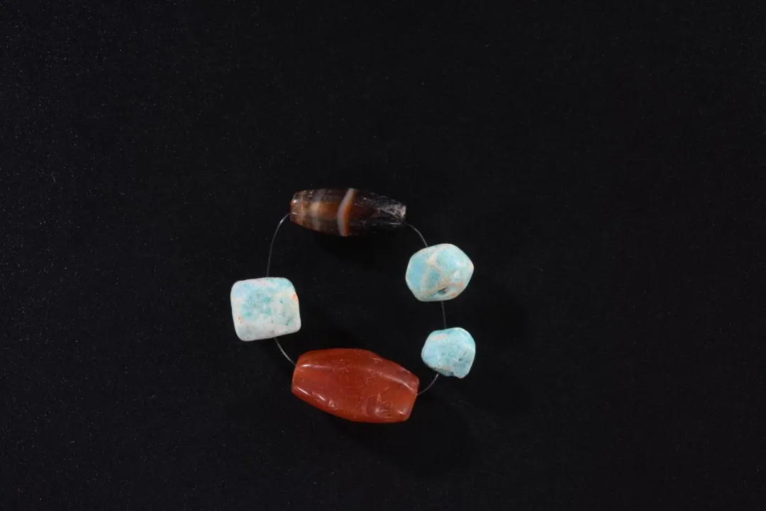 2006年广州市海珠区官洲岛花果山M3出土。材质多样,颜色丰富,制作工艺精良,具有典型的时代特征和地域特色。费昂斯珠来自域外,较为少见。珠串是研究东汉岭南地区宝玉石珠饰制作使用与中外文化贸易交流的重要实物。