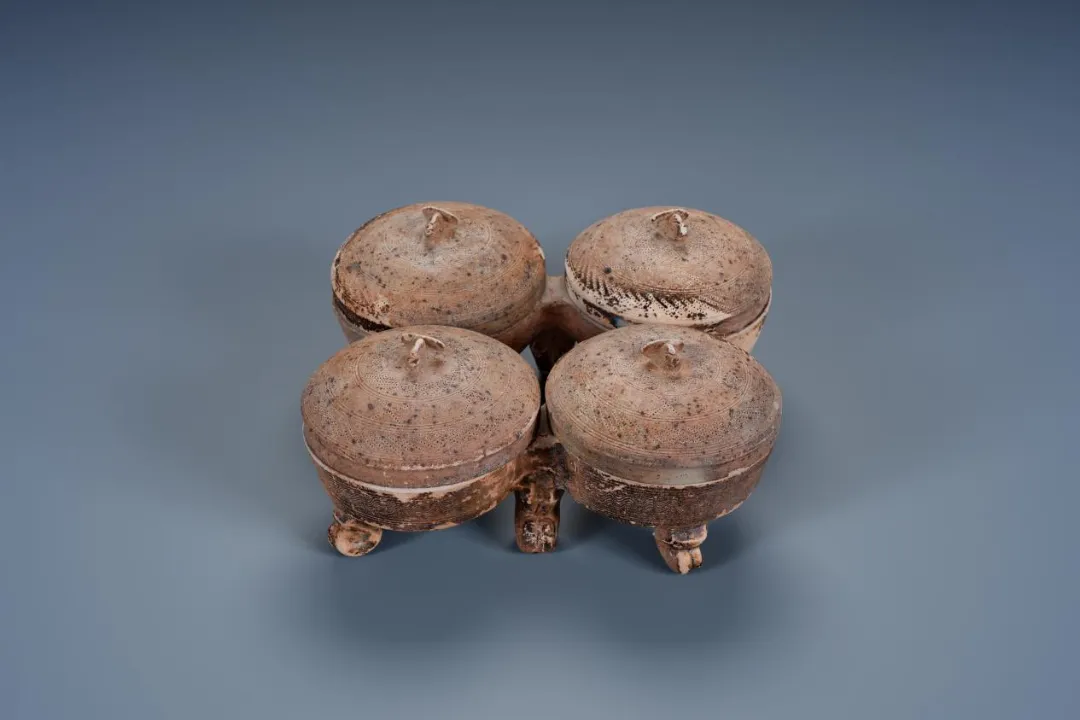 2010年广州市荔湾区西湾路旧广州铸管厂M218出土。由四个小罐呈“田”字形连接组成,饰以弦纹、篦点纹、水波纹,盖钮为简化鸟形象。整体造型独特,简朴自然,六足制作精致,较为少见,属于西汉南越国的典型盛储器,是研究西汉联体陶器制作使用、生活方式及丧葬习俗的重要实物。