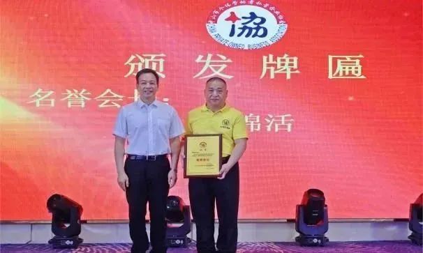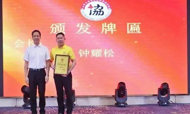 ▲赖文盛为火炬分会名誉会长阮锦活、会长钟耀松颁牌