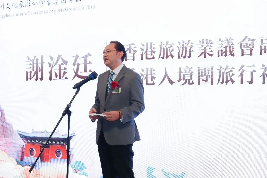 △图为香港旅游业议会副主席、香港入境团旅行社协会主席谢淦廷致辞。
