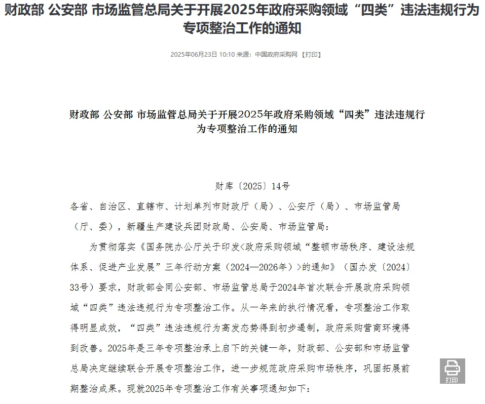 《关于开展2025年政府采购领域“四类”违法违规行为专项整治工作的通知》